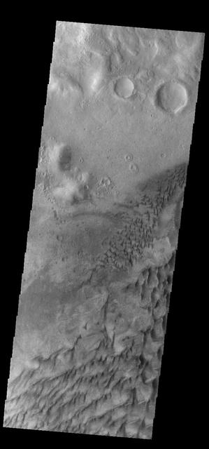 This VIS image shows part of the floor of Russell Crater. Dunes of different shapes and sizes are located on the floor of this 135 km (22 miles) diameter crater. Russell Crater is located in Noachis Terra. Orbit Number: 92871 Latitude: -54.1627 Longitude: 12.4699 Instrument: VIS Captured: 2022-11-21 06:37 https://photojournal.jpl.nasa.gov/catalog/PIA25806