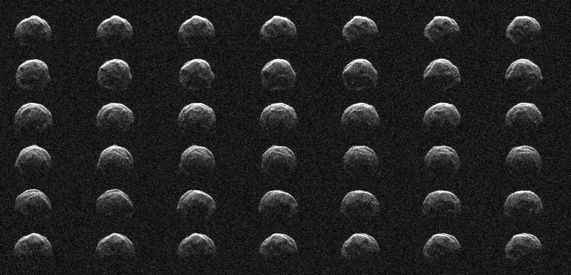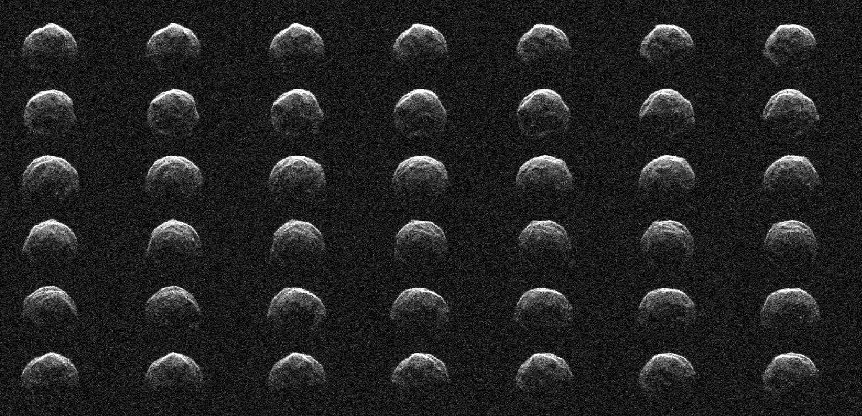 This collage represents a selection of NASA radar observations of near-Earth asteroid 2006 HV5 on April 25, 2023, less than one day before its close approach with our planet at a distance of about 1.5 million miles (2.4 million kilometers, or about 6.3 times the distance between the Moon and Earth). Asteroid 2006 HV5 was discovered by the Lincoln Near-Earth Asteroid Research (LINEAR) program in New Mexico in April 2006. The radar images show that 2006 HV5 is about 1,000 feet (300 meters) across, roughly the height of the Eiffel Tower, confirming size estimates derived from infrared observations made previously by NASA's NEOWISE mission. 2006 HV5 is classified as a potentially hazardous asteroid as its orbit brings it close to Earth, but its path around the Sun is very well known and the asteroid is not an impact risk to our planet. Asteroids of this size come this close to Earth roughly once a year, on average. The new observations were made by scientists at NASA's Jet Propulsion Laboratory using the powerful 230-foot (70-meter) Goldstone Solar System Radar antenna at the Deep Space Network's facility near Barstow, California. The images confirm the asteroid's size, while also providing a detailed look at its meatball-like shape. The asteroid has a rounded appearance, is "squished" at the poles (i.e., it is oblate), and has a rotation period of about 3.6 hours. The sequence of radar images spans slightly more than one rotation. The images, which have a resolution of about 12 feet (3.75 meters) per pixel, reveal surface features such as ridges, flat regions, concavities, and small-scale topography that might indicate boulders. https://photojournal.jpl.nasa.gov/catalog/PIA25834
