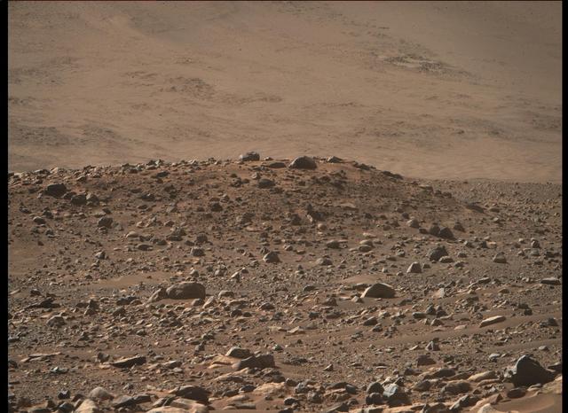 This image of NASA's Ingenuity Mars Helicopter at "Airfield Mu" was taken by the Mastcam-Z instrument aboard Perseverance on April 14, 2023, the 764th Martian day, or sol, of the rover's mission. The helicopter's landing hazard avoidance algorithm helped guide it to a safe landing at Mu the previous sol, after completing its 50th flight. The helicopter is just below and to the left of center in the image. It is about 720 feet (220 meters) away from the rover. The approximately 4-foot-wide (1.2-meter-wide) split boulder, which appears to be directly in front and to the right of the helicopter, is actually about 380 feet (115 meters) in front of the rotorcraft. https://photojournal.jpl.nasa.gov/catalog/PIA25883