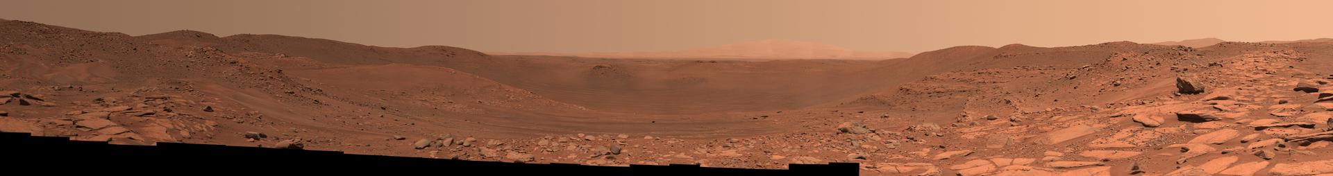 This view of the interior of Belva Crater was generated using data collected by the Mastcam-Z instrument aboard NASA's Perseverance Mars rover on April 22, 2023, the 772nd Martian day, or sol, of the mission. When the 152 individual images that make up this mosaic were taken, the rover was parked at the west side of the crater's rim, on a light-toned rocky outcrop the science team is calling "Echo Creek." Belva Crater is about 0.6 miles (0.9 kilometers) in diameter. The view here is looking across the crater towards the distant east-northeast wall of the much-larger Jezero Crater (center of the image), some 25 miles (40 kilometers) away. Impact craters like Belva can offer grand views and contain vertical cuts that provide important clues to the geologic history of the area. The mosaic shows multiple locations of bedrock exposed in vertical cross-section. One of these exposed sections of bedrock (located on the hill seen between the 60 and 75 hashmarks) is angled steeply downward and is nearly 65 feet (20 meters) tall. Called "dipping beds," such a steeply angled bedrock section could indicate the presence of a large Martian sandbar made of sediment that billions of years ago was deposited by a river flowing into the lake that Jezero Crater once held. The most distant point on Belva Crater's rim (just to the left of center in the mosaic) is about 3,500 feet (1,060 meters) away from the rover. The large boulder seen in the far right of the mosaic is about 65 feet (20 meters) away and is about 5 feet (1.5 meters) in diameter. Arizona State University leads the operations of the Mastcam-Z instrument, working in collaboration with Malin Space Science Systems in San Diego, on the design, fabrication, testing, and operation of the cameras, and in collaboration with the Niels Bohr Institute of the University of Copenhagen on the design, fabrication, and testing of the calibration targets. A key objective for Perseverance's mission on Mars is astrobiology, including the search for signs of ancient microbial life. The rover will characterize the planet's geology and past climate, pave the way for human exploration of the Red Planet, and be the first mission to collect and cache Martian rock and regolith (broken rock and dust). Subsequent NASA missions, in cooperation with ESA (European Space Agency), would send spacecraft to Mars to collect these sealed samples from the surface and return them to Earth for in-depth analysis. The Mars 2020 Perseverance mission is part of NASA's Moon to Mars exploration approach, which includes Artemis missions to the Moon that will help prepare for human exploration of the Red Planet. https://photojournal.jpl.nasa.gov/catalog/PIA25889