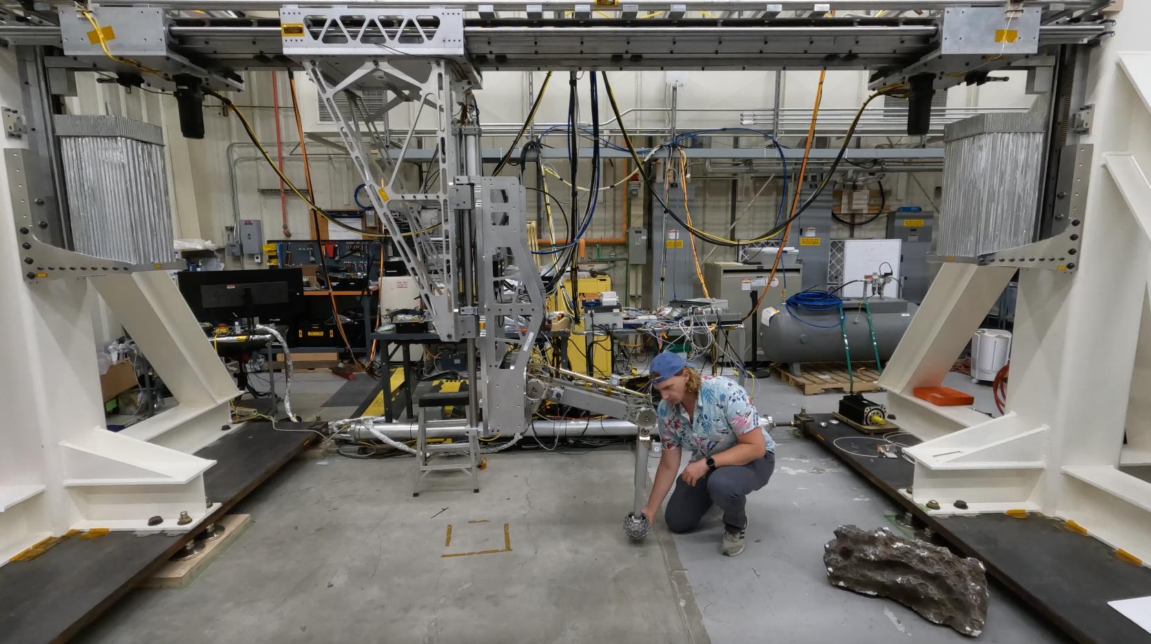 Engineer Matthew Cameron-Hooper performs a checkout on some systems of the Europa Lander landing gear testbed at NASA's Jet Propulsion Laboratory in Southern California on May 27, 2022. Europa Lander is a concept for a potential future mission that would look for signs of life in the icy surface material of Jupiter's moon Europa. The moon is thought to contain a global ocean of salty water beneath its frozen crust. If life exists in that ocean, signs of its existence called biosignatures could potentially find their way to the surface. In this mission concept, a spacecraft would land on Europa and collect and study samples from about 4 inches (10 centimeters) beneath the surface, looking for signs of life. The Europa Lander landing gear testbed was developed to test and inform the design of the landing gear for the spacecraft: It mimics the landing loads and ground interaction forces that a single flight landing gear would experience when touching down on the Europan surface. It does this by using gravity offloading to simulate the reduced gravity on Europa, and by replicating the mass and inertial properties of a flight lander as well as all the degrees of freedom that the landing gear would experience. This system checkout confirmed two critical functionalities of the testbed: low friction of the horizontal degree of freedom that carries the test landing gear, and proper functioning of the gravity offloading system. Together these functionalities ensure that only ground interaction forces cause the test landing gear to come to a stop during a test, just as a flight landing gear would experience when landing on the Europan surface. Video available at https://photojournal.jpl.nasa.gov/catalog/PIA26200