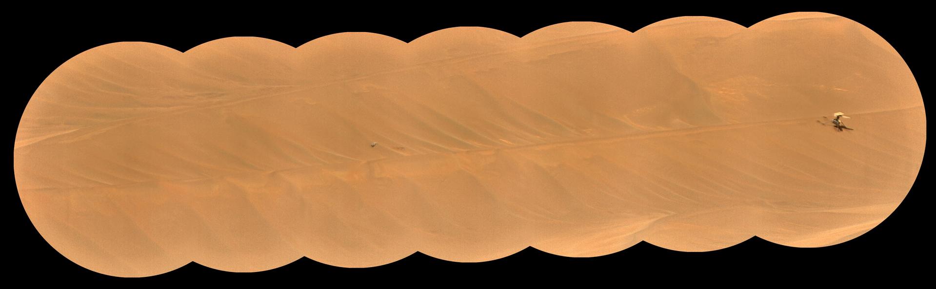 The Remote Microscopic Imager (RMI) camera aboard NASA's Perseverance Mars rover took these zoomed-in images of the Ingenuity Mars Helicopter and one of its rotor blades on Feb. 24, 2024, the 1,072nd Martian day, or sol, of the mission. The mosaic shows the helicopter at right, standing at an angle near the apex of a sand ripple. About 49 feet (15 meters) to the west of the helicopter's location (just left of center in the image), a large portion of one of the helicopter's rotor blades lies on the surface. The Ingenuity team is considering a theory that the blade detached after the rotorcraft impacted the Martian surface at the conclusion of the helicopter's 72nd and final flight on Jan. 18, 2024. This mosaic is made up of seven images taken by the RMI, which is part of the rover's SuperCam instrument. At the time these images were taken, the distance between the rover and helicopter was about 1,365 feet (415 meters). Each circular image has a field of view of 26 feet (7.8 meters) at this distance. Able to spot a softball from nearly a mile away, the RMI allows scientists to take images of details from a long distance. It also provides fine details of nearby targets zapped by SuperCam's laser. SuperCam is led by Los Alamos National Laboratory in New Mexico, where the instrument's body unit was developed. The mast unit, including the RMI used for these images, was developed and built by several laboratories of the CNRS (the French research center) and French universities under the contracting authority of Centre National d'Études Spatiales (CNES), the French space agency. A key objective for Perseverance's mission on Mars is astrobiology, including the search for signs of ancient microbial life. The rover will characterize the planet's geology and past climate, pave the way for human exploration of the Red Planet, and be the first mission to collect and cache Martian rock and regolith (broken rock and dust). Subsequent NASA missions, in cooperation with ESA (European Space Agency), would send spacecraft to Mars to collect these sealed samples from the surface and return them to Earth for in-depth analysis. The Mars 2020 Perseverance mission is part of NASA's Moon to Mars exploration approach, which includes Artemis missions to the Moon that will help prepare for human exploration of the Red Planet. https://photojournal.jpl.nasa.gov/catalog/PIA26238