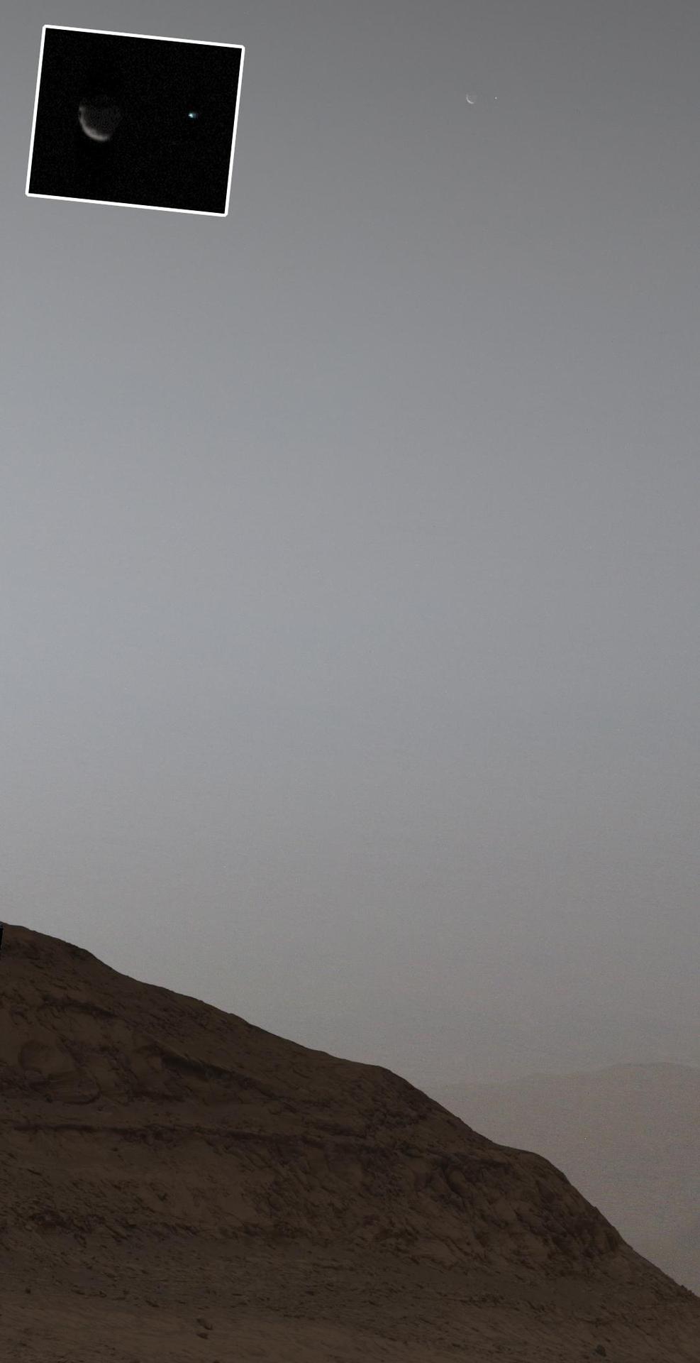 NASA's Curiosity Mars rover used its Mast Camera, or Mastcam, to capture this view of Earth setting while Phobos, one of Mars' two moons, is rising. It's the first time an image of the two celestial bodies have been captured together from the surface of Mars. The image is a composite of five short exposures and 12 long exposures all taken on Sept. 5, 2024, the 4,295th Martian day, or sol, of Curiosity's mission. An inset in the image shows Phobos on the left and Earth on the right. From the rover's perspective, the inset area would be about half the width of a thumb held at arm's length. The image shows the sky over Texoli, a butte on lower Mount Sharp, a 3-mile-tall (5-kilometer-tall) mountain that Curiosity has been ascending since 2014. https://photojournal.jpl.nasa.gov/catalog/PIA26362