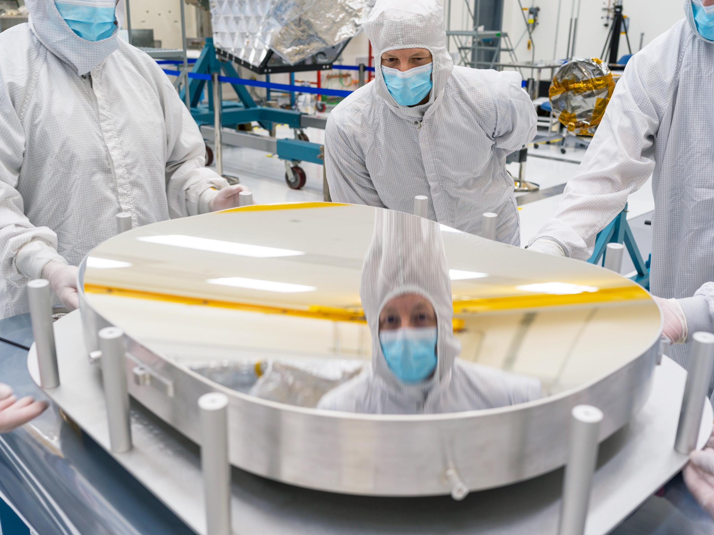 A mirror set to be installed inside the telescope for NASA's Near-Earth Object Surveyor (NEO Surveyor) is seen during an inspection of the mirror's surface at NASA's Jet Propulsion Laboratory in Southern California on July 17, 2024. Being built in a JPL clean room, the infrared telescope is the spacecraft's only instrument and it will be used to seek out some of the hardest-to-find near-Earth objects that may pose a hazard to our planet. The reflection of principal optical engineer Brian Monacelli can be seen in the mirror. Known as a "three-mirror anastigmat telescope," the instrument will rely on a set of curved mirrors to focus light onto its infrared detectors in such a way that minimizes optical aberrations. Before being installed, the mirrors were examined for any debris or damage. Then, JPL's team of optomechanical technicians and engineers attached the mirrors to the telescope's "optical bench" in August. Next, they will measure the telescope's performance and align the telescope's mirrors. When complete, the telescope will be housed inside an instrument enclosure – being built at JPL in a different clean room – that is fabricated from dark composite material that allows heat to escape, helping to keep the telescope cool and prevent its own heat from obscuring observations. https://photojournal.jpl.nasa.gov/catalog/PIA26386