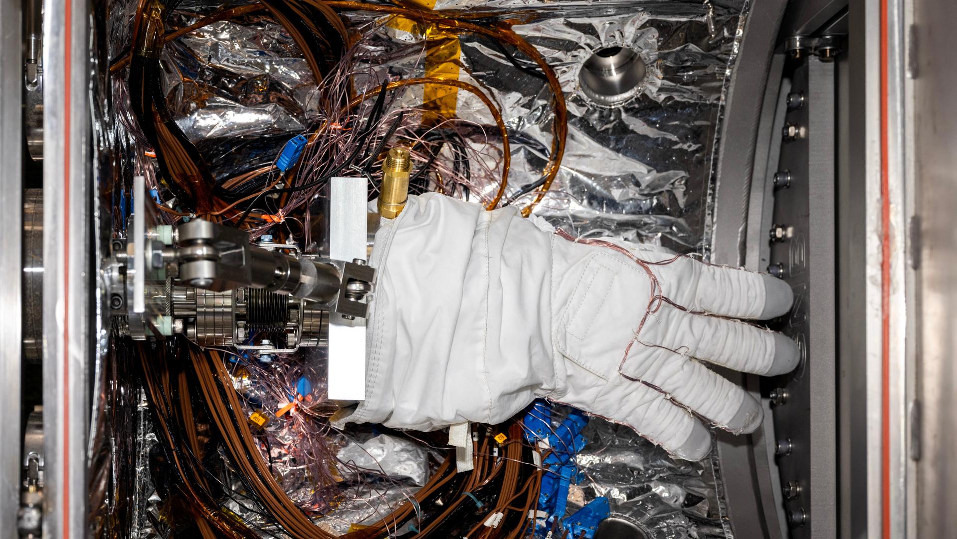 An astronaut glove designed for use during spacewalks on the International Space Station is prepared for thermal vacuum testing inside a chamber at NASA's Jet Propulsion Laboratory in Southern California on Nov. 1, 2023. The glove lies in a load lock, one of four small drawer-like chambers through which test materials are inserted into the larger main chamber of a facility called CITADEL (Cryogenic Ice Testing, Acquisition Development, and Excavation Laboratory). The glove was tested at vacuum and temperatures as low as minus 352 degrees Fahrenheit (minus 213 degrees Celsius) – temperatures as frigid as those Artemis III astronauts could experience on the Moon's South Pole. Built to prepare potential future robotic spacecraft for the frosty, low-pressure conditions on ocean worlds like Jupiter's frozen moon Europa, CITADEL has also proven key to evaluating how astronaut gloves and boots hold up in extraordinary cold. The NASA Engineering and Safety Center spearheaded a glove testing campaign in CITADEL from October 2023 to March 2024. Part of a spacesuit design called the Extravehicular Mobility Unit, the gloves tested in the chamber are the sixth version of a glove NASA began using in the 1980s. The testing in CITADEL showed that the legacy glove would not meet thermal requirements in the more challenging lunar South Pole environment. In addition to spotting vulnerabilities with existing suits, the CITADEL experiments will help NASA develop this unique test capability and prepare criteria for standardized, repeatable, and inexpensive test methods for the next-generation lunar suit being built by Axiom Space. https://photojournal.jpl.nasa.gov/catalog/PIA26430