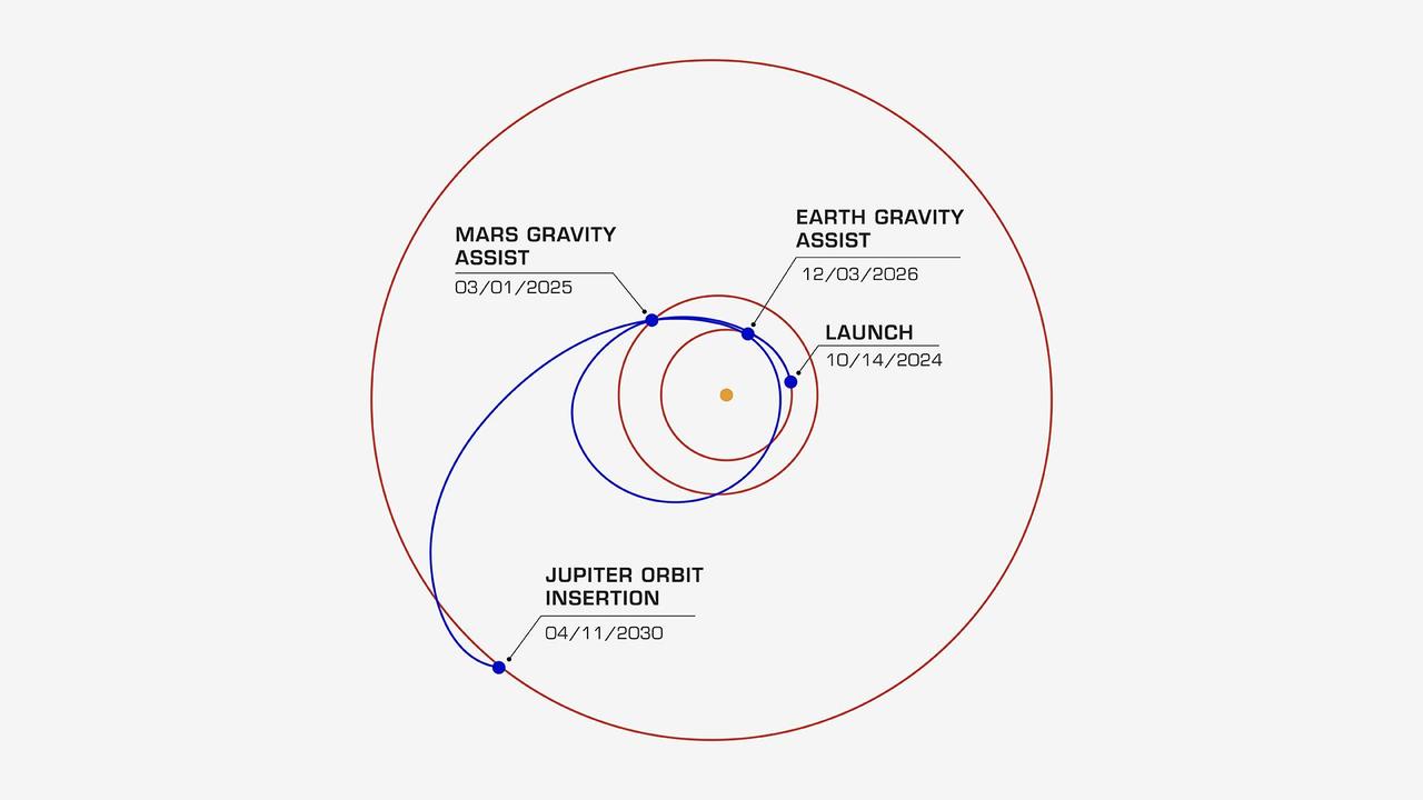 On its journey to the Jupiter system, NASA's Europa Clipper will take a path that swings past Mars, then Earth, using the gravity of each planet as a slingshot to boost the spacecraft's speed. All told, the journey will take about 5½ years, covering a distance of about 1.8 billion miles (2.9 billion kilometers). In this diagram, the orbits of Jupiter, Mars, and Earth are shown as concentric rings. Europa Clipper's launch period begins on Oct. 10, 2024. If the spacecraft launches on a later date, the timing of its Mars and Earth gravity assist maneuvers will shift. For all liftoff dates within the launch period, however, the spacecraft is scheduled to begin orbiting Jupiter on April 11, 2030. Then it will begin its investigation of the gas giant's icy moon Europa. Europa Clipper's three main science objectives are to determine the thickness of the moon's icy shell and its interactions with the ocean below, to investigate its composition, and to characterize its geology. The mission's detailed exploration of Europa will help scientists better understand the astrobiological potential for habitable worlds beyond our planet. Managed by Caltech in Pasadena, California, NASA's Jet Propulsion Laboratory leads the development of the Europa Clipper mission in partnership with APL for NASA's Science Mission Directorate in Washington. APL designed the main spacecraft body in collaboration with JPL and NASA's Goddard Space Flight Center in Greenbelt, Maryland, NASA's Marshall Space Flight Center in Huntsville, Alabama, and Langley Research Center in Hampton, Virginia. The Planetary Missions Program Office at Marshall executes program management of the Europa Clipper mission. NASA's Launch Services Program, based at Kennedy, manages the launch service for the Europa Clipper spacecraft, which will launch on a SpaceX Falcon Heavy rocket from Launch Complex 39A at Kennedy. https://photojournal.jpl.nasa.gov/catalog/PIA26435