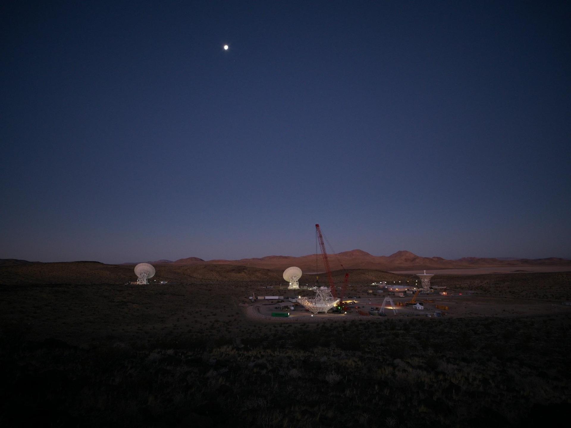 In the early morning of Dec. 18, 2024, a crane looms over the 112-foot-wide (34-meter-wide) steel framework for Deep Space Station 23 (DSS-23) reflector dish, which will soon be lowered into position on the antenna's base structure. Located at the Deep Space Network's Goldstone Space Communications Complex near Barstow, California, DSS-23 is a multi-frequency beam waveguide antenna that will boost the DSN's capacity and enhance NASA's deep space communications capabilities for decades to come. In the background are, from left to right, the beam waveguide antennas DSS-25 and DSS-26, and the decommissioned 85-foot (26-meter) Apollo antenna. https://photojournal.jpl.nasa.gov/catalog/PIA26456