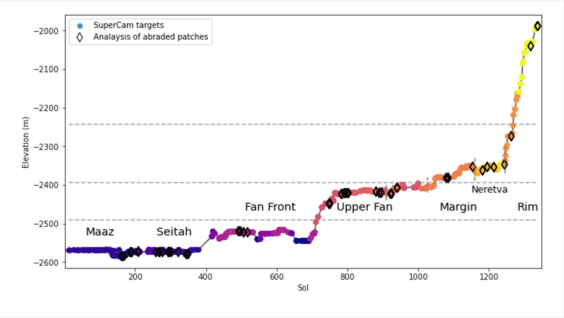This graph shows the relative elevation of various sampling sites visited by NASA's Perseverance Mars rover. Colored dots along the line represent targets where data was collected by the rover's SuperCam laser instrument; the colors correspond to different regions within Jezero Crater, which are labeled. The black diamonds represent locations where the rover's abrasion tool was used to collect data on rock composition. The x-axis indicates the sol, or day, of the rover's mission, and the y-axis shows elevation in meters. Jezero Crater sits about 8,530 feet (2,600 meters) below reference level (the equivalent for "sea level" on Mars, which does not have any oceans), which is why the numbers appear to be decreasing as Perseverance is gaining elevation. The dotted horizontal lines represent estimated levels of ancient, now-dry lakes. Jezero Crater was filled by water for much of its history; this lake environment could have preserved signs of microbial life, if any formed here billions of years ago. At the far right of the graph, the line suddenly jumps, indicating a sharp elevation gain, showing how quickly the rover has ascended toward the crater rim. A key objective for Perseverance's mission on Mars is astrobiology, including the search for signs of ancient microbial life. The rover will characterize the planet's geology and past climate, pave the way for human exploration of the Red Planet, and be the first mission to collect and cache Martian rock and regolith (broken rock and dust). Subsequent NASA missions, in cooperation with ESA (European Space Agency), would send spacecraft to Mars to collect these sealed samples from the surface and return them to Earth for in-depth analysis. The Mars 2020 Perseverance mission is part of NASA's Moon to Mars exploration approach, which includes Artemis missions to the Moon that will help prepare for human exploration of the Red Planet. https://photojournal.jpl.nasa.gov/catalog/PIA26476