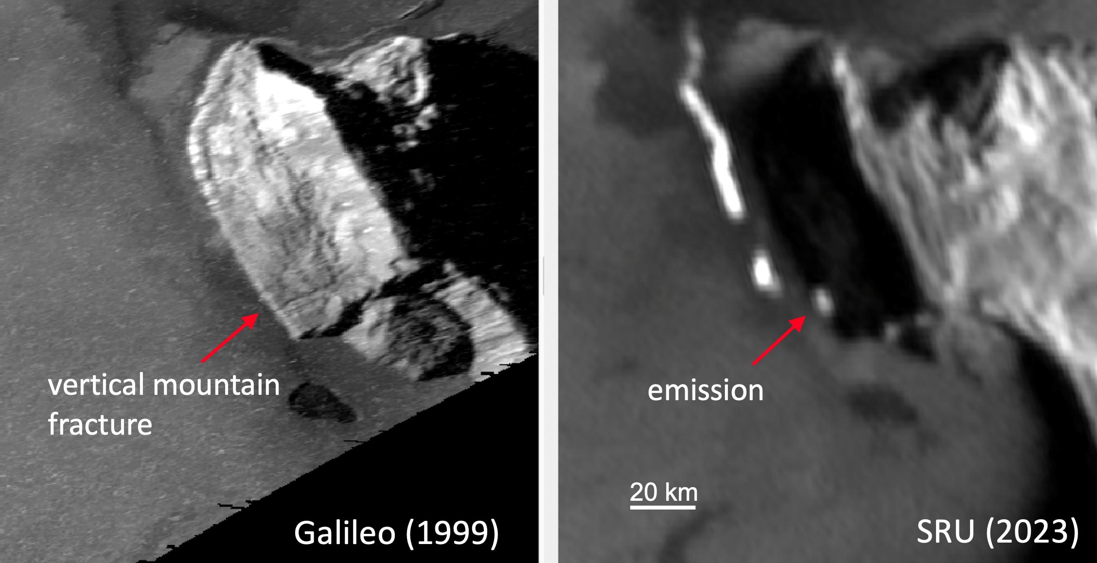 While imaging Io's night side under illumination from Jupiter-shine on Dec. 30, 2023, the Stellar Reference Unit (SRU) on NASA's Juno spacecraft observed an unprecedented glow from active lava at the base of a mountain on Io (red arrow, right panel). The thermal emission signature was located at the base of the western flank of South Zal Mons. Sunlit imagery of the region by captured by NASA's Galileo mission circa 1999 (at left) shows a vertical mountain fracture running from the top of the mountain to the location of the SRU-observed "glow" (red arrow, left panel). One hypothesis is that an extension of the mountain fracture created a fissure vent that allows lava to escape to the surface at this location. https://photojournal.jpl.nasa.gov/catalog/PIA26522