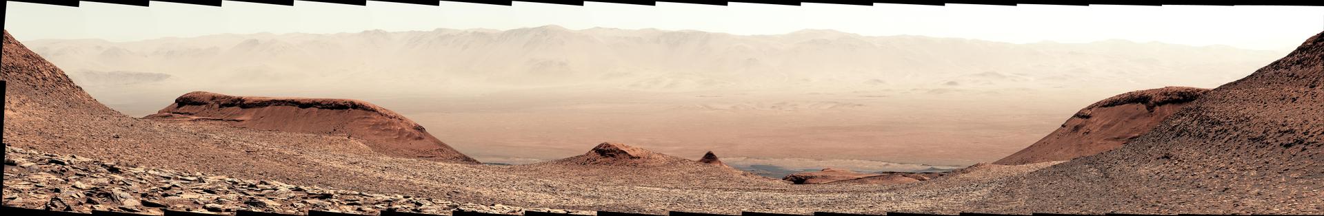 NASA's Curiosity Mars rover captured this view looking back down at the floor of Gale Crater from its location on Mount Sharp on Feb. 7, 2025, the 4,447th Martian day, or sol, of the mission. Curiosity was continuing its climb through a region of the mountain called the sulfate-bearing unit. Mount Sharp is a 3-mile-tall (5-kilometer-tall) mountain made up of a number of layers, all of which formed in different eras of Martian history. By studying each layer, the rover's team can learn more about how the Martian environment changed over time from a warmer, wetter, and more Earthlike world to the freezing desert it is today. The mountain is inside of Gale Crater, formed by an ancient asteroid impact. What appears to be a mountain range in the distance of this scene is in fact the crater's rim. The color in these images has been adjusted to match the lighting conditions as the human eye would see them on Earth. https://photojournal.jpl.nasa.gov/catalog/PIA26551