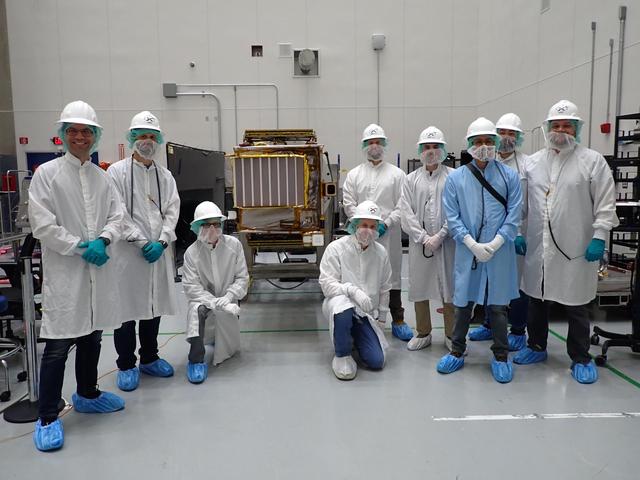 Members of NASA's Lunar Trailblazer team pose with the spacecraft at SpaceX's payload processing facility at NASA's Kennedy Space Center in Florida in early February 2025. The grated radiator of the High-resolution Volatiles and Minerals Moon Mapper (HVM³) instrument is facing the camera. Pictured, from left: Andrew Klesh, Jeff Pyle, Ryan Kressler, Willie Parker, Jon Newman, Alex Sugarman, David Rodriquez, Chris Calamateos-Brown, and David Hobbs. https://photojournal.jpl.nasa.gov/catalog/PIA26581