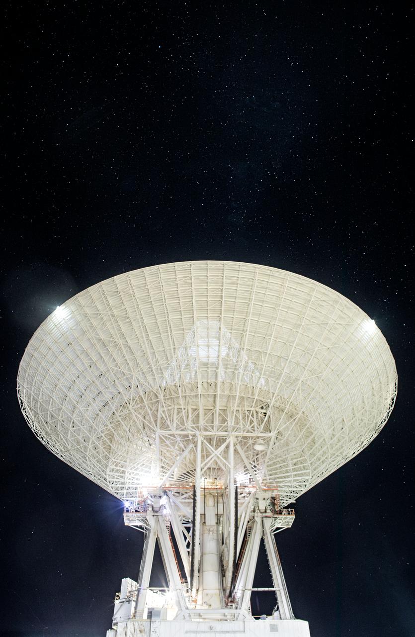 Deep Space Station 14 (DSS-14), the 230-foot-wide (70-meter) antenna at the Goldstone Deep Space Communications Complex near Barstow, California, points up toward a starry sky in September 2025. Goldstone is part of NASA’s Deep Space Network (DSN), which operates three complexes around the globe to support communications with dozens of deep space missions. DSS-14 is also the agency’s Goldstone Solar System Radar, which is used to observe asteroids that come close to Earth. For more information about the DSN, visit: https://www.nasa.gov/communicating-with-missions/dsn/