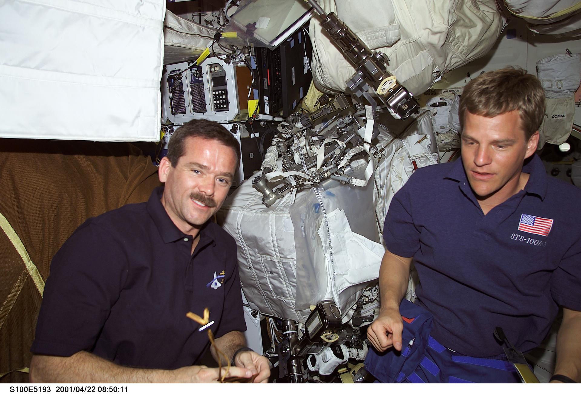S100-E-5193 (21 April 2001) --- Astronauts Chris A. Hadfield (left) of the Canadian Space Agency (CSA) and Scott E. Parazynski, both mission specialists for STS-100, share thoughts of scheduled April 22 extravehicular activity (EVA), while inspecting equipment on the middeck of the Space Shuttle Endeavour. The image was recorded with a digital still camera.