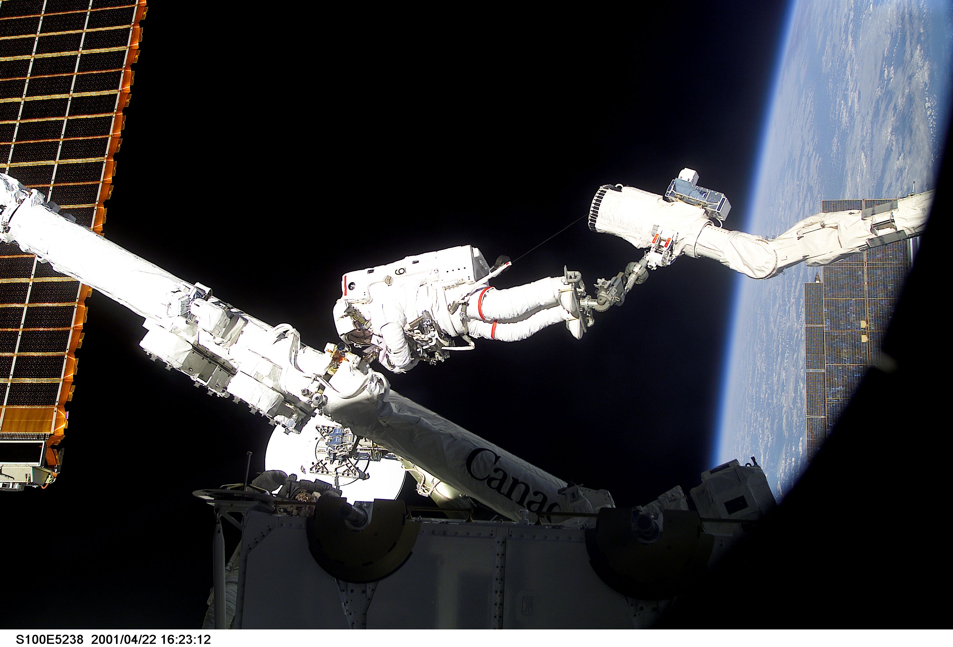S100-E-5238 (22 April 2001) --- Astronaut Chris A. Hadfield, STS-100 mission specialist representing the Canadian Space Agency (CSA), stands on one Canadian-built robot arm to work with another one. Called Canadarm2, the newest addition to the International Space Station (ISS) was ferried up to the orbital outpost by the STS-100 crew. Hadfield's feet are secured on a special foot restraint attached to the end of the Remote Manipulator System (RMS) arm, which represents one of the standard shuttle components for the majority of the 100-plus STS missions thus far. The picture was recorded with a digital still camera.