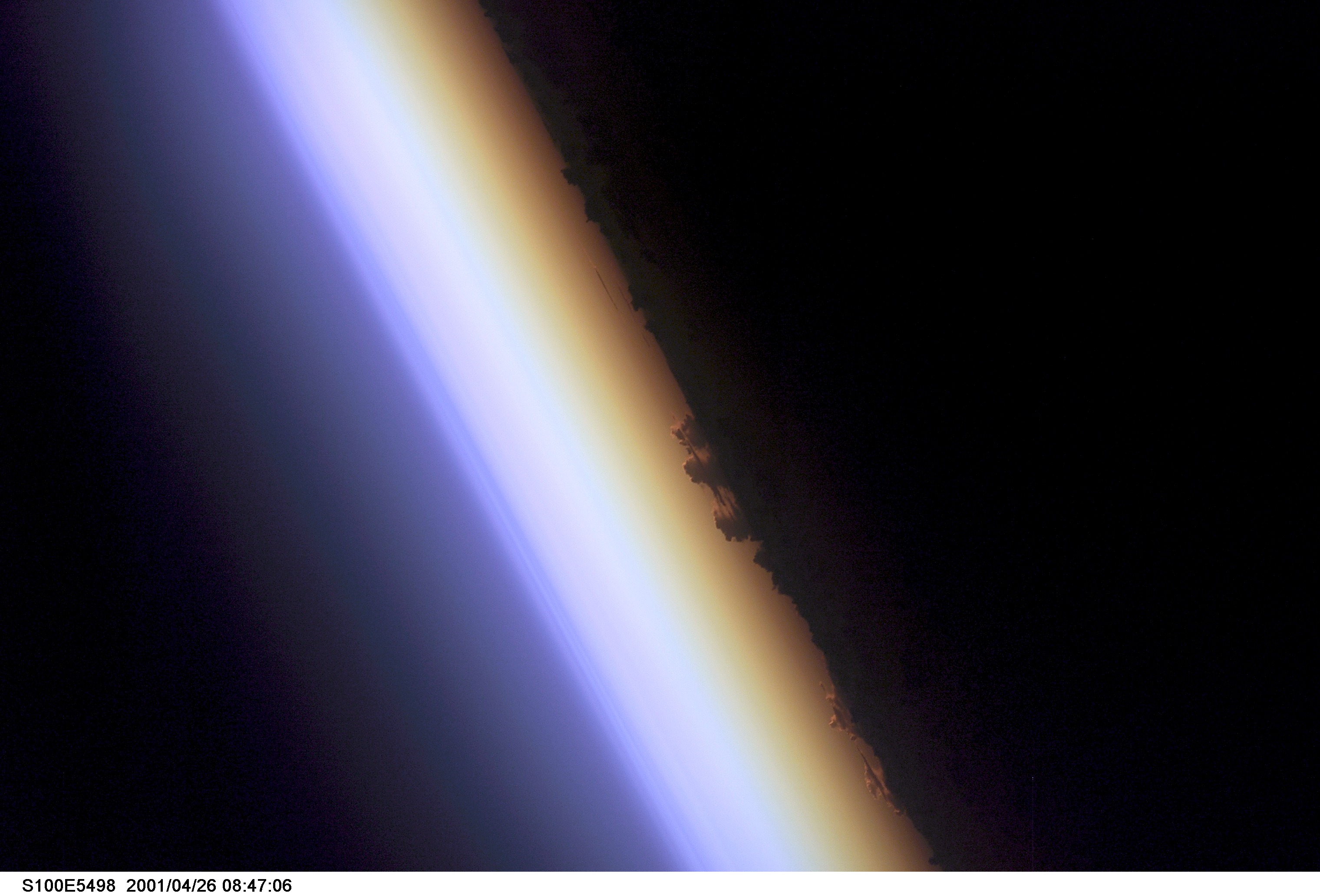 S100-E-5498 (26 April 2001) --- Earth's limb--the edge of the planet seen at twilight--was captured with a digital still camera by one of the STS-100 crew members aboard the Space Shuttle Endeavour. Near center frame the silhouette of cloud layers can be seen in the atmosphere, above which lies an airglow layer (left).