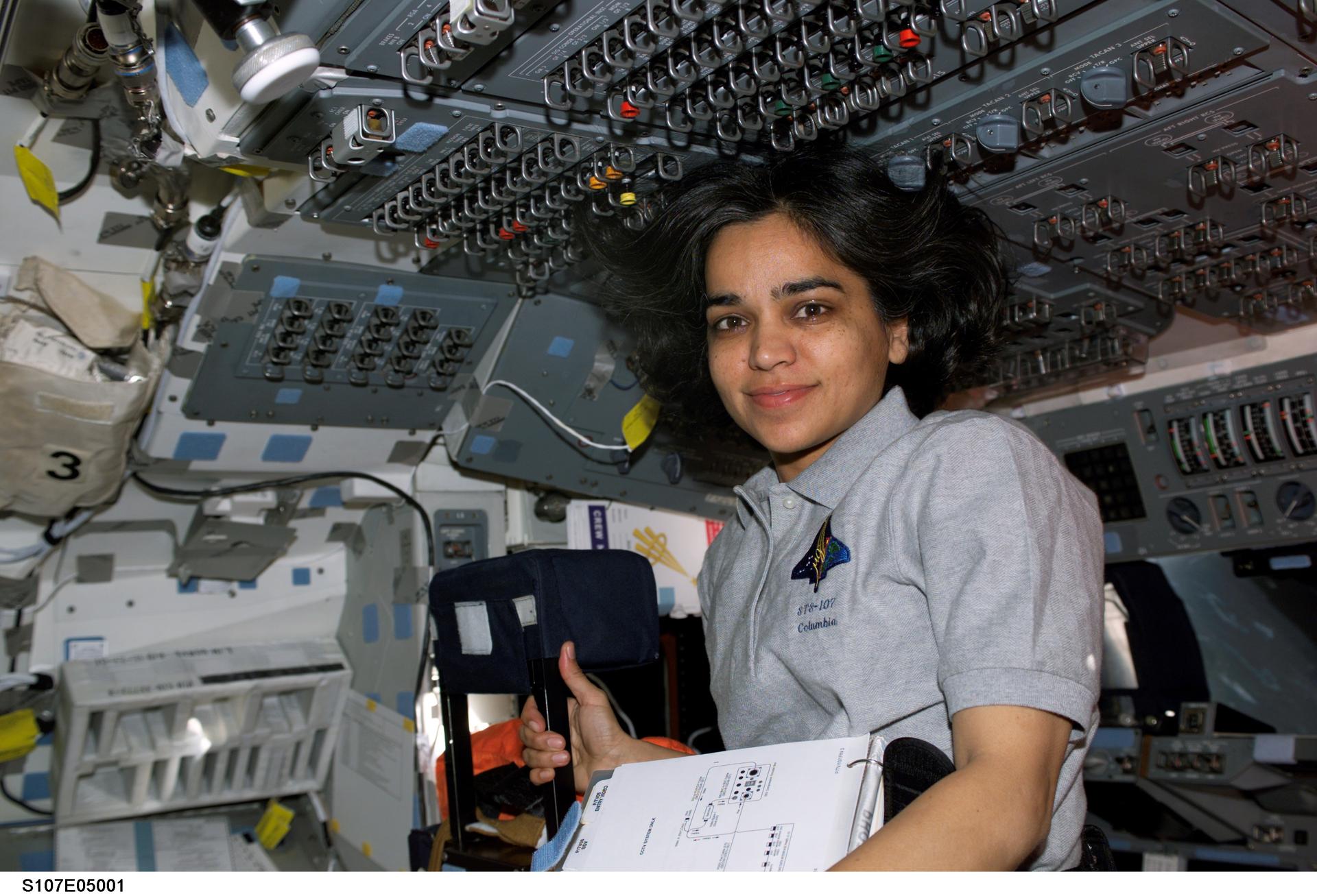 STS107-E-05001 (17 January 2003) --- Astronaut Kalpana Chawla, STS-107 mission specialist, is pictured on the flight deck of the Earth-orbiting Space Shuttle Columbia.