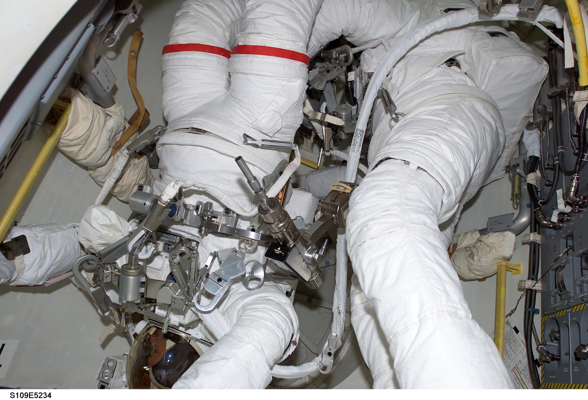 STS109-E-5234 (4 March 2002) --- Astronauts John M. Grunsfeld (left), payload commander, and Richard M. (Rick) Linnehan, mission specialist, are just moments away from going from a crowded situation into a more spacious venue as they prepare to egress the airlock of the Space Shuttle Columbia for the first of their assigned STS-109 space walks to perform work on the Hubble Space Telescope (HST).The two went on to replace the giant telescope’s starboard solar array during a space walk that ended at 7:38 a.m. (CST) or 13:38 GMT March 4, 2002.