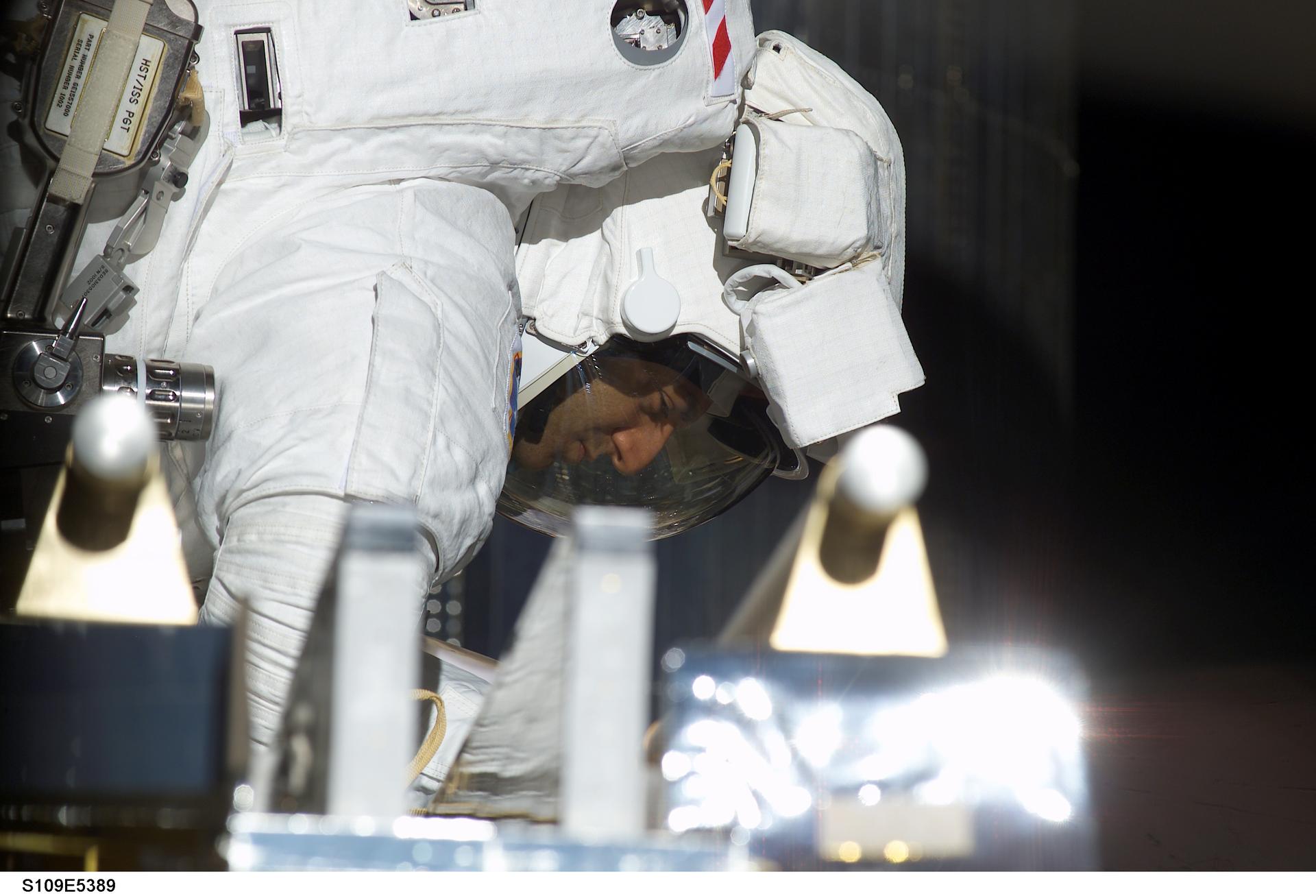 STS109-E-5389 (5 March 2002) --- Astronaut James H. Newman, mission specialist, returns to a stowage area in the cargo bay of the Space Shuttle Columbia during the STS-109 mission's second day of extravehicular activity (EVA). Astronauts Newman and Michael J. Massimino worked to replace the second set of solar arrays on the Hubble Space Telescope (HST). The image was recorded with a digital still camera.
