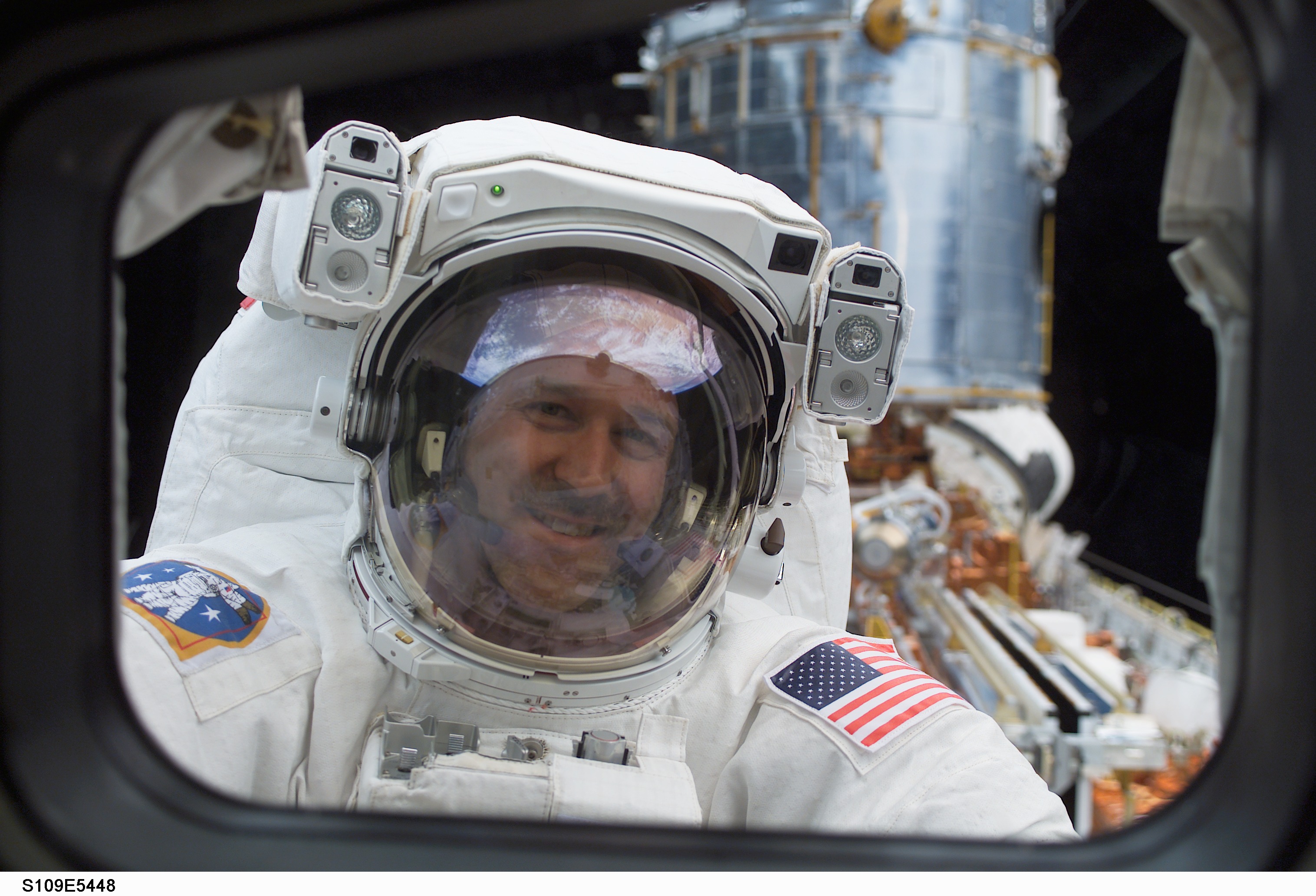 STS109-E-5448 (4 March 2002) --- Astronaut John M. Grunsfeld, payload commander, peers into the crew cabin of the Space Shuttle Columbia during the first STS-109 extravehicular activity (EVA-1) on March 4, 2002. Grunsfeld's helmet visor displays a mirrored image of the Earth's hemisphere. Astronauts Grunsfeld and Richard M. Linnehan replaced the starboard solar array on the Hubble Space Telescope (HST) on the first of five scheduled STS-109 space walks. The lower portion of the giant telescope can be seen over Grunsfeld's left shoulder. The image was recorded with a digital still camera by a crewmate on shuttle's aft flight deck.