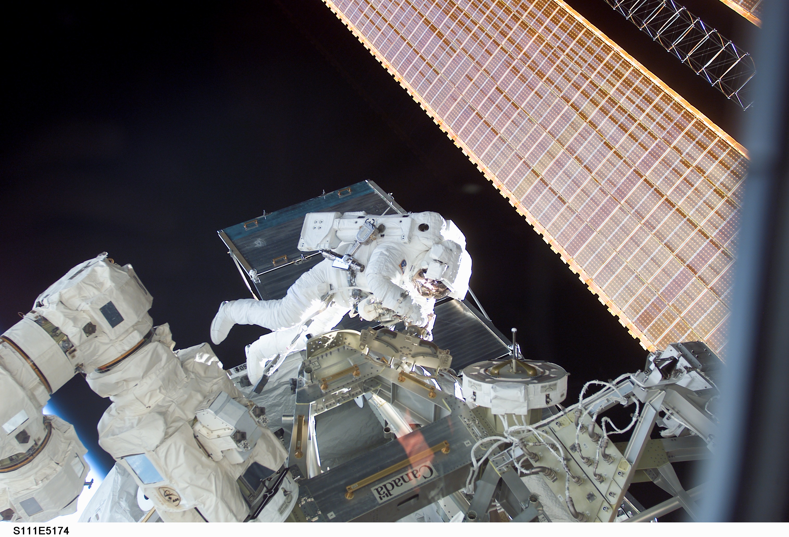 STS111-E-5174 (11 June 2002) --- Astronaut Philippe Perrin, mission specialist representing CNES, the French Space Agency, participates in the second scheduled session of extravehicular activity (EVA) for the STS-111 mission. During the spacewalk, Perrin and Chang-Diaz attached power, data and video cables from the International Space Station (ISS) to the Mobile Base System (MBS) and used a power wrench to complete the attachment of the MBS onto the Mobile Transporter (MT).