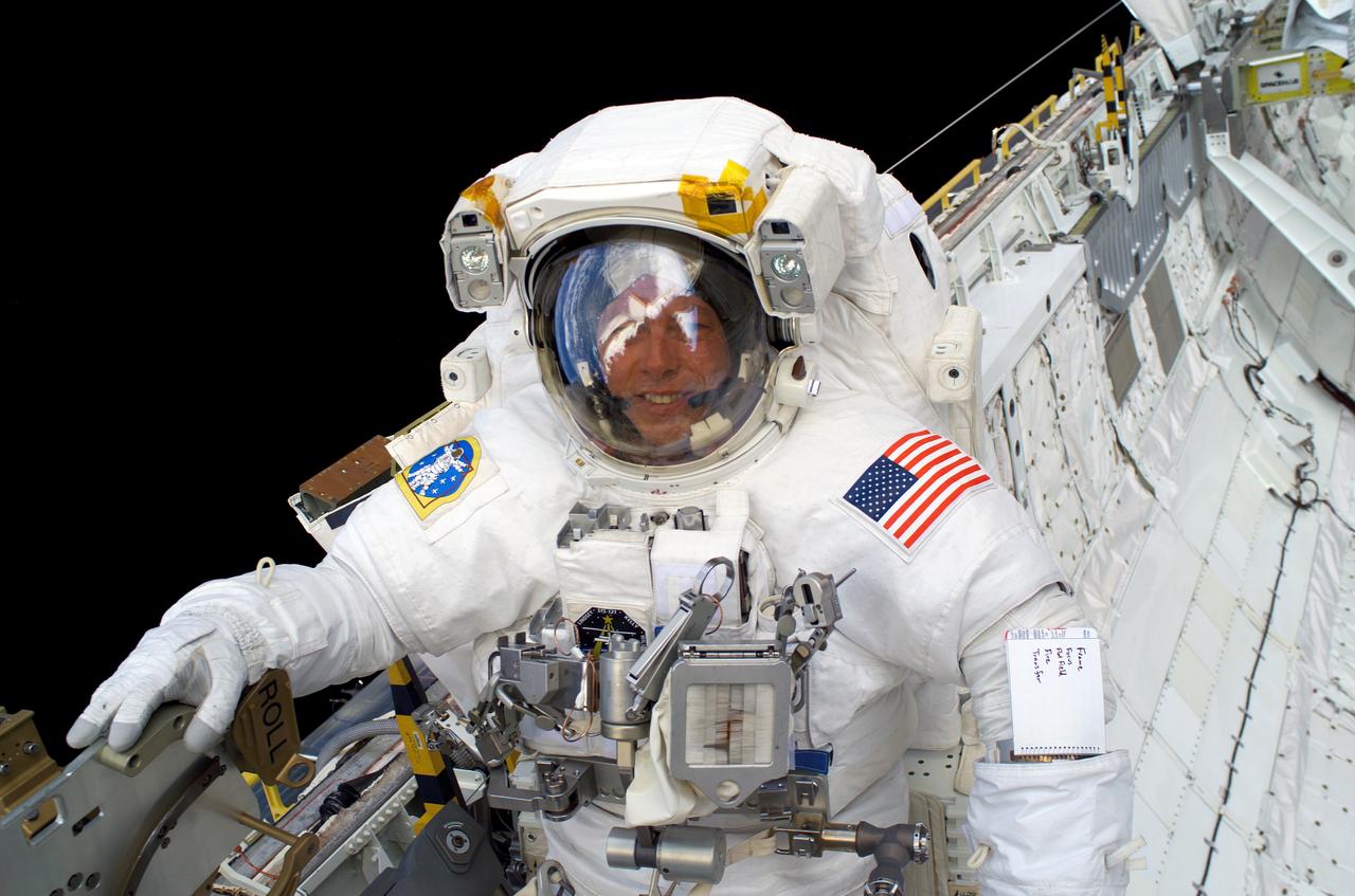 S121-E-06685 (12 July 2006) --- Astronaut Michael E. Fossum, STS-121 mission specialist, works in Space Shuttle Discovery's cargo bay during the mission's third and final session of extravehicular activity (EVA). The demonstration of orbiter heat shield repair techniques was the objective of the 7-hour, 11-minute excursion outside the shuttle and the International Space Station.