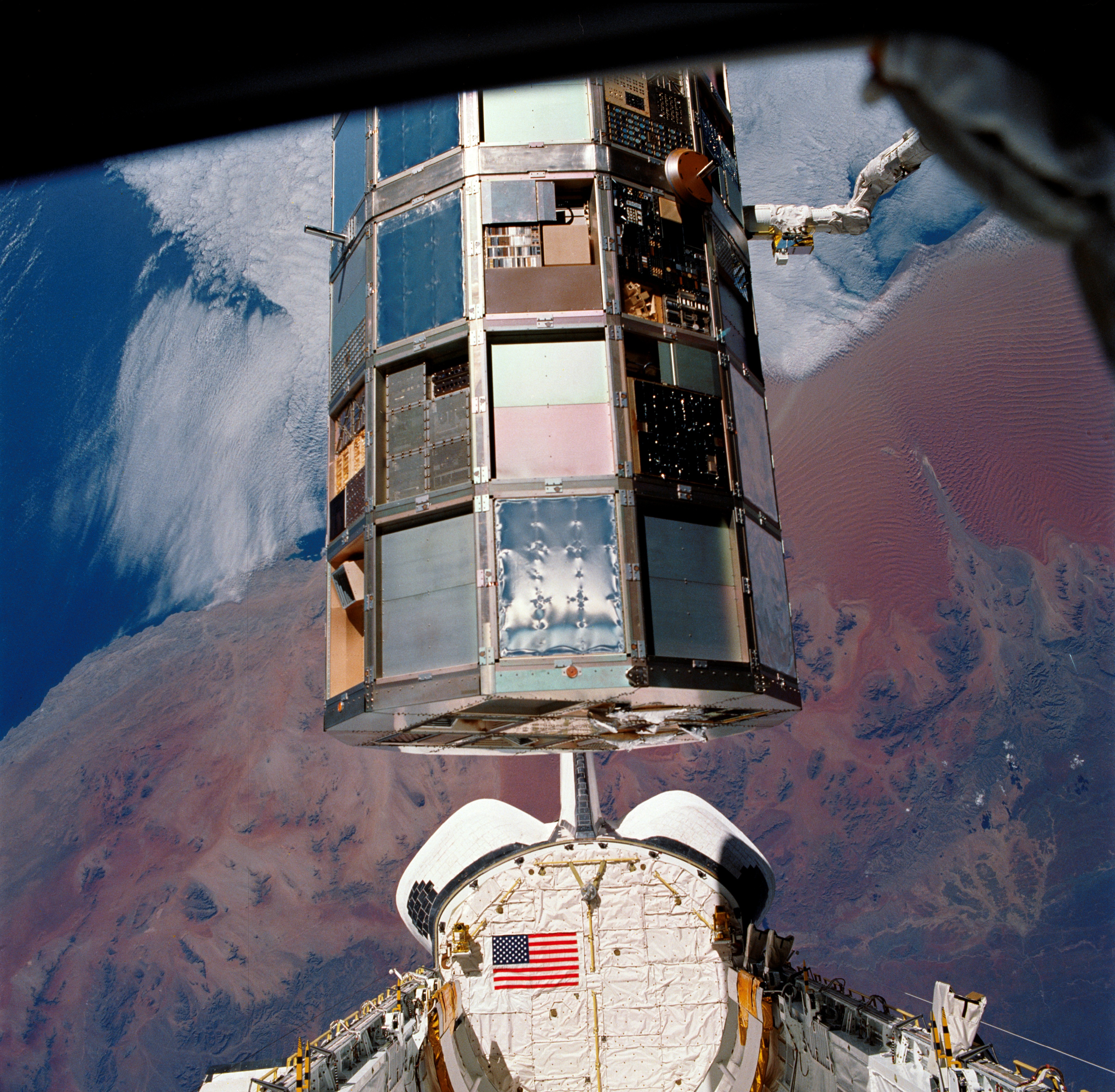 STS032-85-029 (12 Jan. 1990) --- (ORIENT PHOTO WITH COLUMBIA'S CARGO BAY IN LOWER CENTER). This 70mm frame was taken during a battery of documentary photographs of the recently-recaptured Long Duration Exposure Facility (LEDF). The Atlantic Coast of Namibia serves as a backdrop for the colorful scene. After five-and-one half years orbiting Earth, LDEF was retrieved by STS-32 crewmembers and brought back home at the end of the eleven-day mission for scientific observation. The bus-sized spacecraft was held in the grasp of Columbia's remote manipulator system (RMS) end effector during the survey.