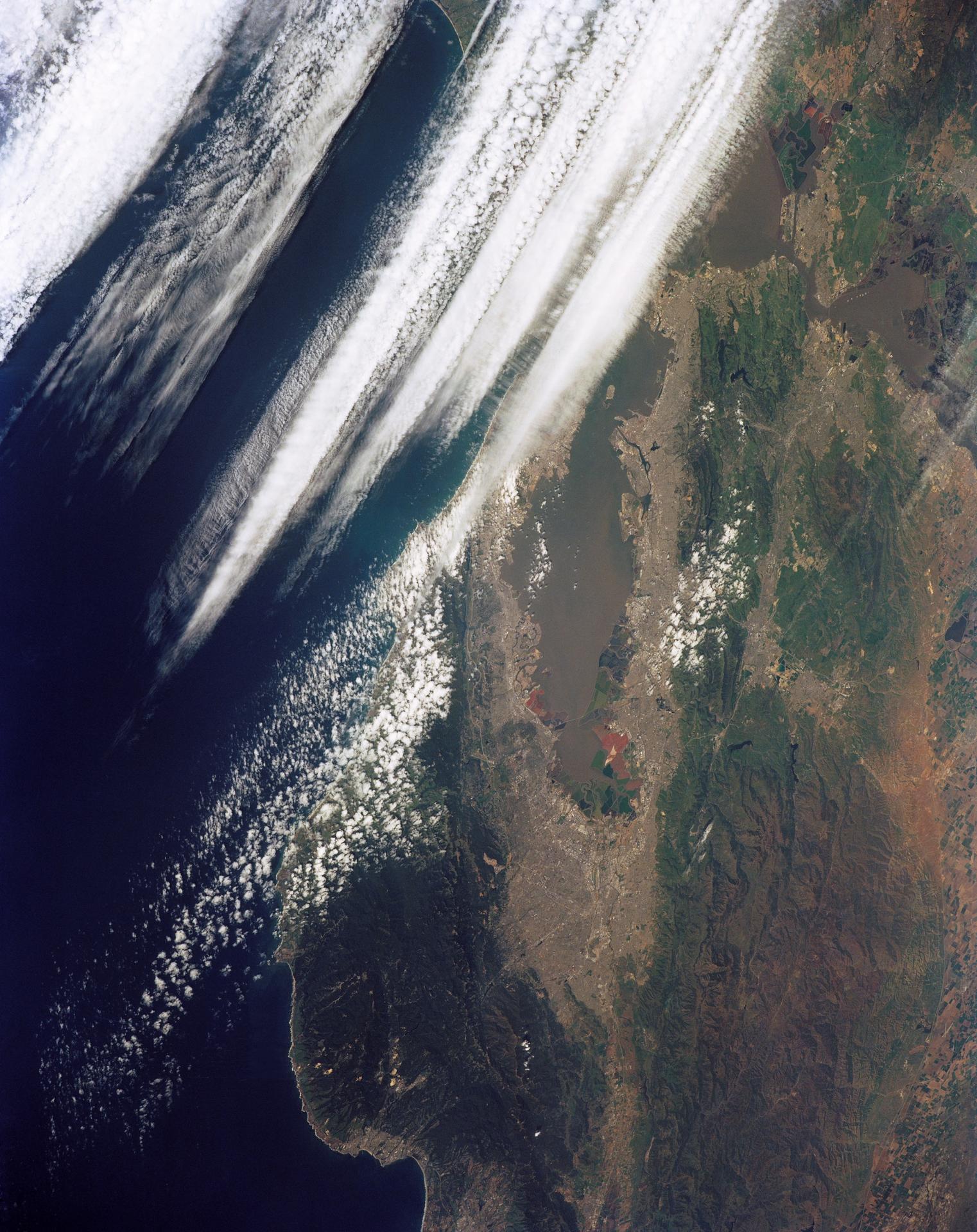 STS039-151-181A (28 April-6 May 1991) --- Large format (five-inch) frame of the San Francisco/Oakland Bay Area of northern California. Stratus clouds at 35,000 feet and cumulus clouds at about 15,000 feet are seen over the Pacific Coast, obscuring the Golden Gate Bridge.