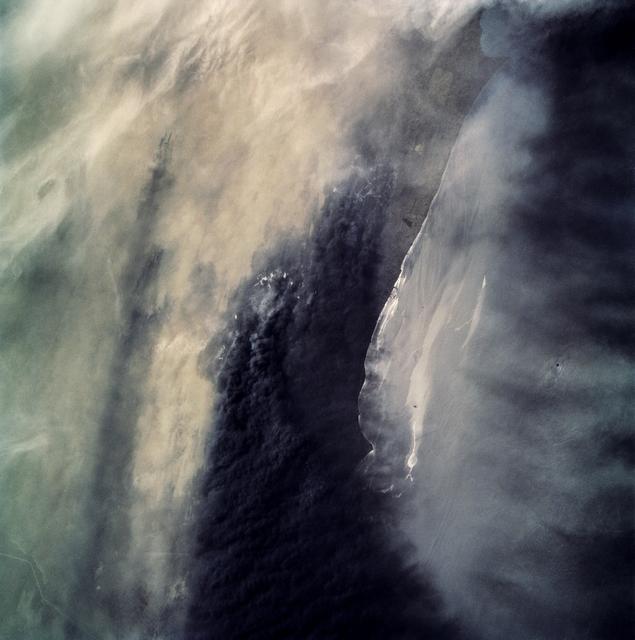 STS039-87-012 (28 April-6 May 1991) --- A handheld 70mm camera onboard the Space Shuttle Discovery exposed this infrared frame showing oil fires near the Kuwait coast as well as south-bound oil slicks in the Gulf. Pools of oil on the land are recognized as white objects near the burning wells.