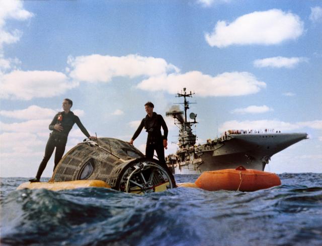 S65-61887 (16 Dec. 1965) --- A water level view of Navy divers with the Gemini 6 spacecraft.