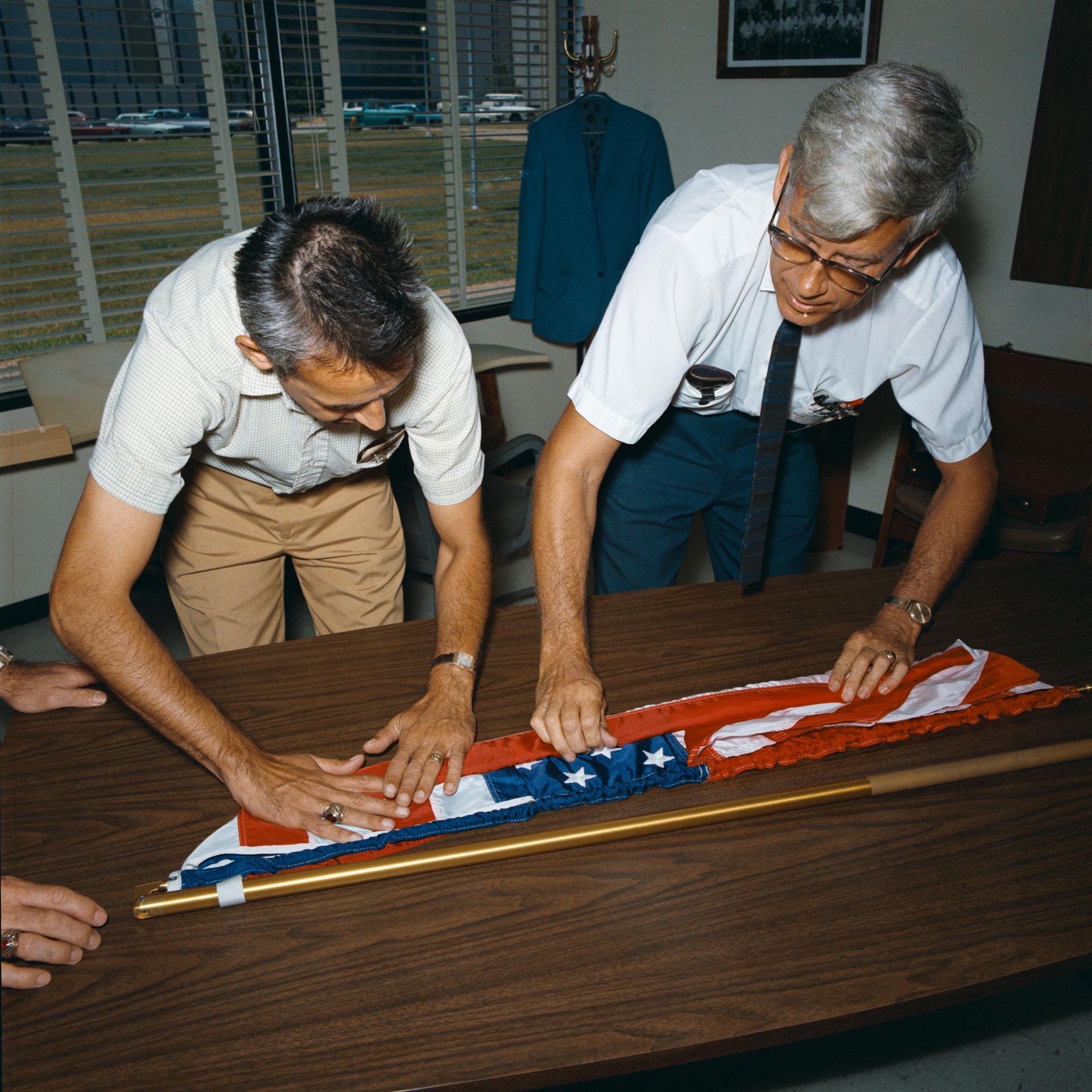 S69-38765 (1969) -- Jack Kinzler, right, with the U.S. flag kit for Apollo 11, seen in the technical services shop in Building 9.