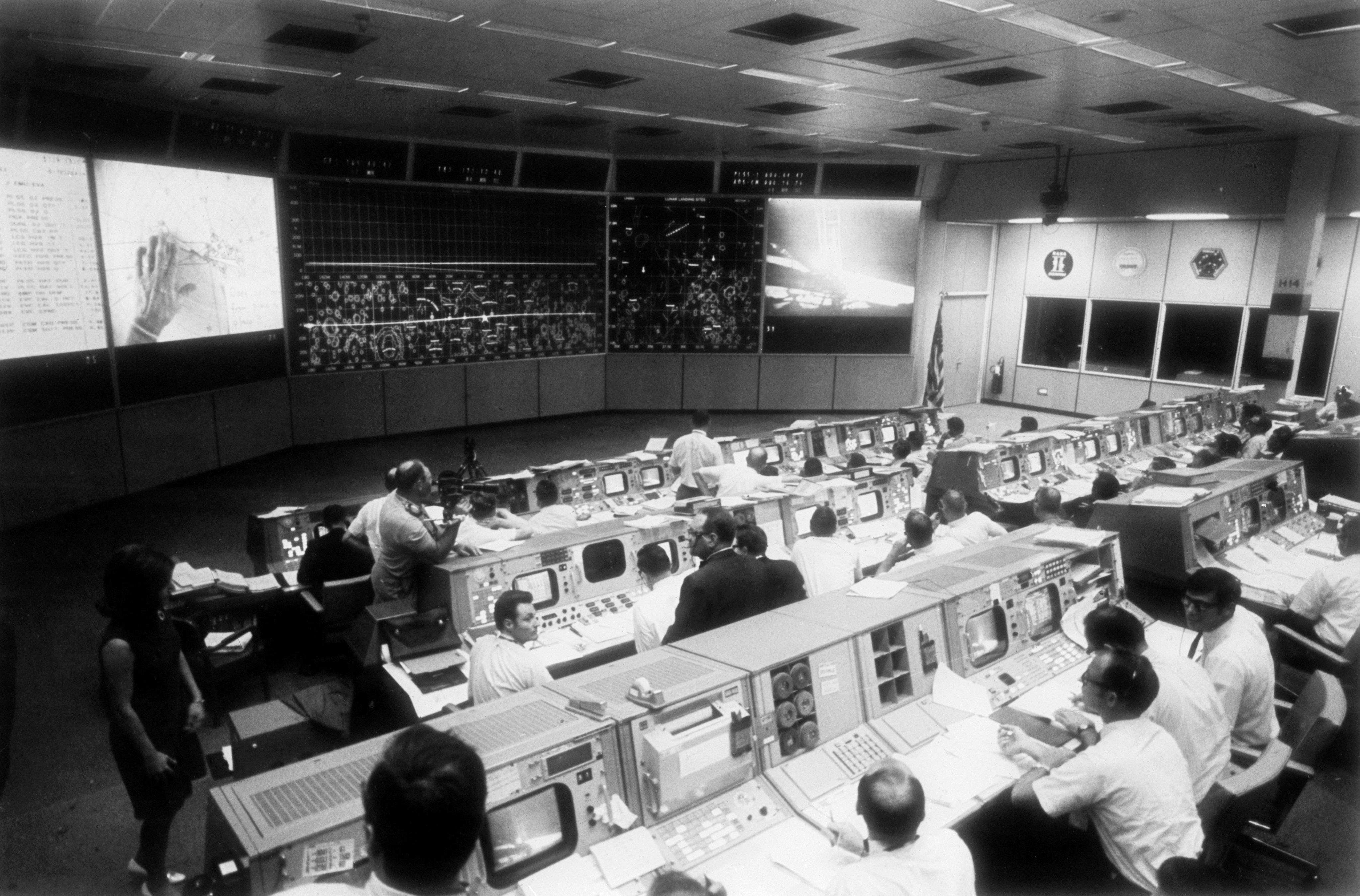 Overall view of the Mission Operations Control Room in the Mission Control Center, bldg 30, during the lunar surface extravehicular activity (EVA) of Apollo 11 Astronauts Neil A. Armstrong and Edwin E. Aldrin Jr.