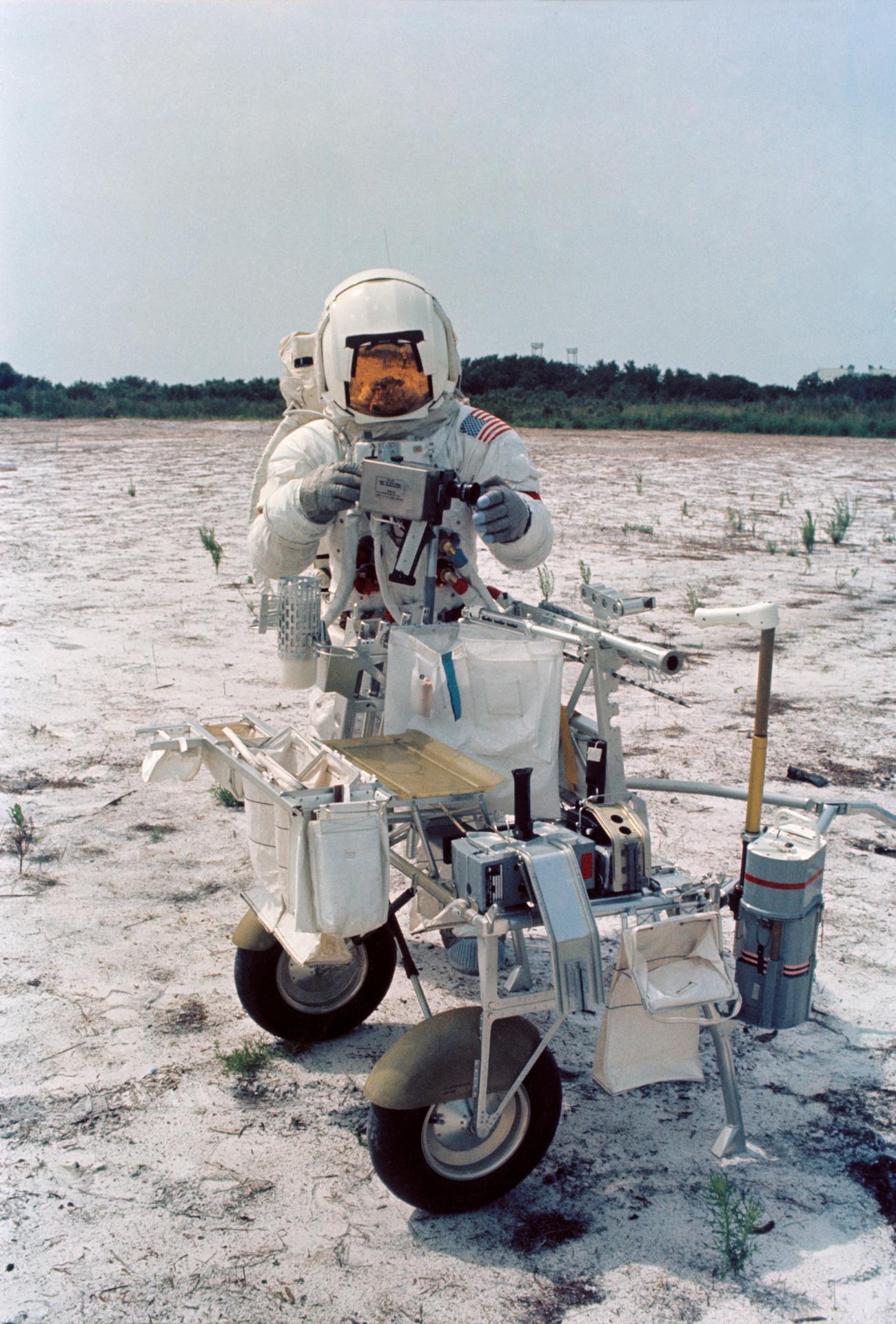 S70-46191 (July 1970) --- Astronaut Alan B. Shepard Jr., commander of the Apollo 14 lunar landing mission, participates in lunar surface training at the Kennedy Space Center (KSC). Shepard is adjusting a camera mounted to the modular equipment transporter (MET). The MET, nicknamed the "Rickshaw", will serve as a portable work bench with a place for the Apollo lunar hand tools and their carrier, three cameras, two sample container bags, a special environment sample container, spare magazines, and a lunar surface Penetrometer. Shepard is wearing an Extravehicular Mobility Unit (EMU).