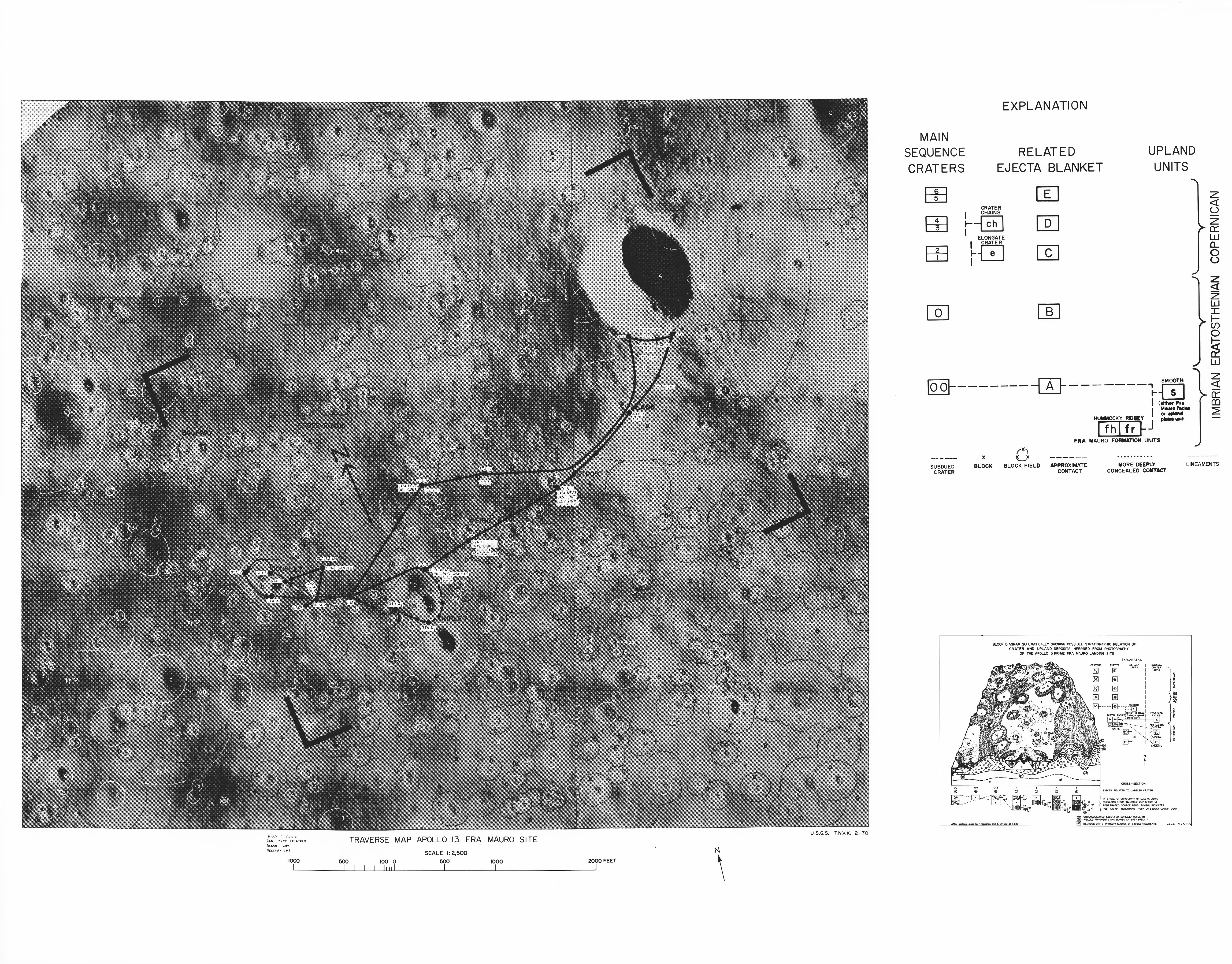 This lunar map shows the traverse plans for the Apollo 14 lunar landing mission. Areas marked include Lunar module landing site, areas for the Apollo Lunar Surface Experiment Package (ALSEP) and areas for gathering of core samples.