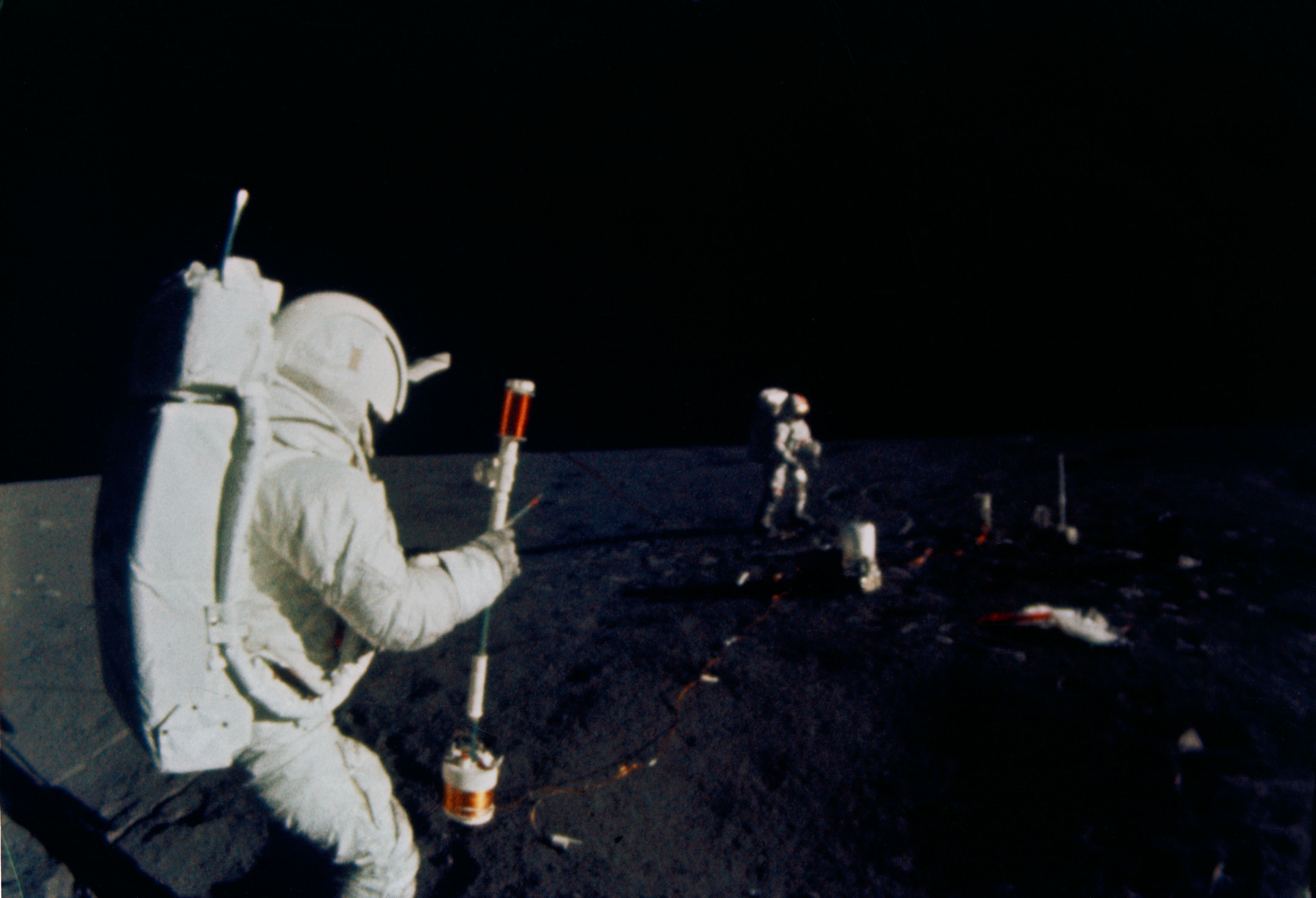 S71-19509 (5 Feb. 1971) --- Astronaut Edgar D. Mitchell, lunar module pilot, operates the Active Seismic Experiment's (ASE) thumper during the first Apollo 14 extravehicular activity (EVA) on the moon. Astronaut Alan B. Shepard Jr., commander, walks near deployed components of the Apollo Lunar Surface Experiments Package (ALSEP) in the background. This photograph was taken by an automatic 16mm camera mounted on the Apollo lunar hand tool carrier aboard the Modularized Equipment Transporter (MET). While astronauts Shepard and Mitchell descended in the LM to explore the moon, astronaut Stuart A. Roosa, command module pilot, remained with the Command and Service Modules (CSM) in lunar orbit.