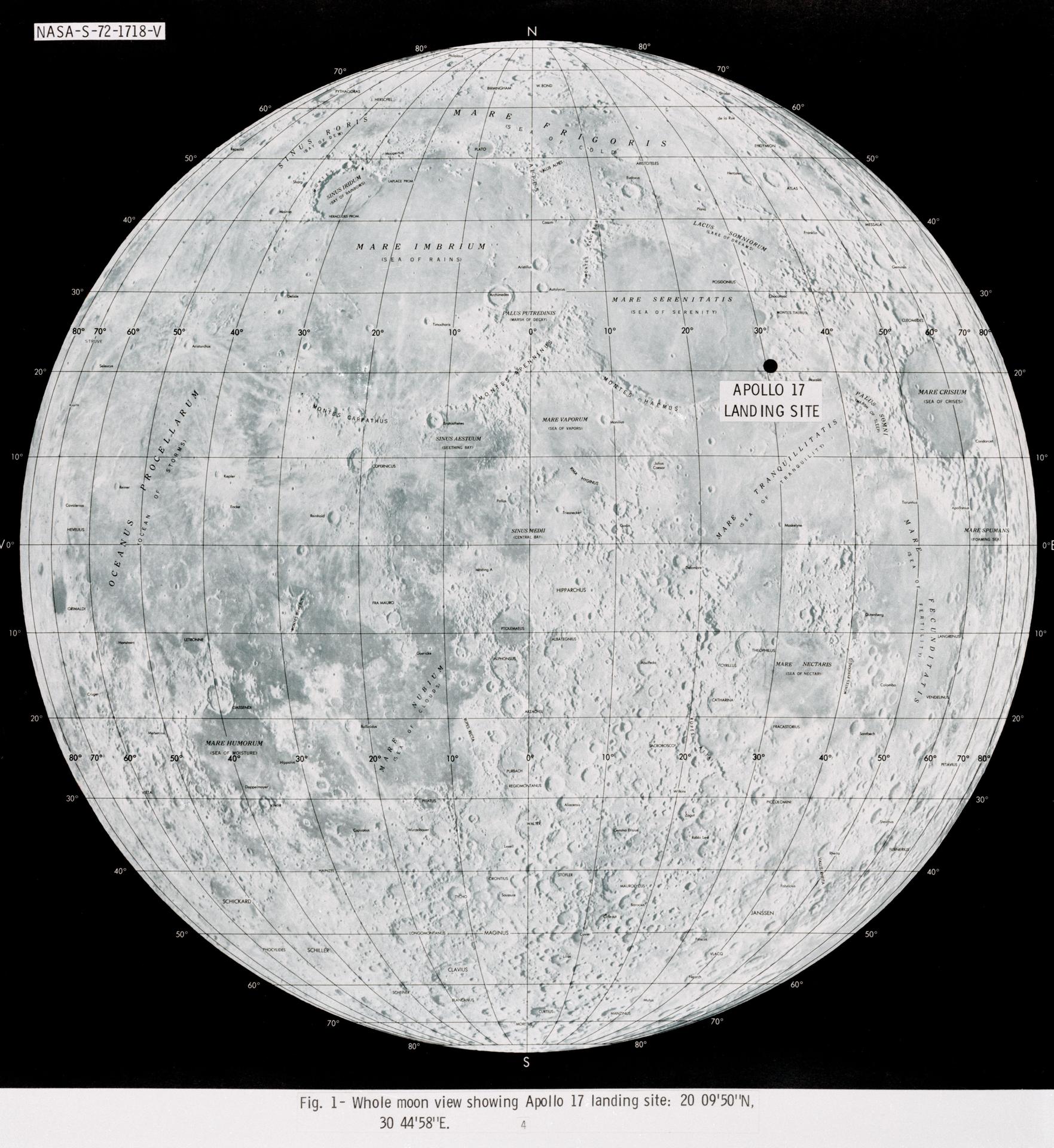 S72-01718 (July 1972) --- A photographic illustration of a full moon showing the location of the Apollo 17 landing site on the lunar nearside. The black dot pinpointing the landing site is in the Taurus-Littrow area at the southeastern edge of the Sea of Serenity. The coordinates of the landing point are 30 degrees 44 minutes 58 seconds east longitude and 20 degrees 9 minutes 50 seconds north latitude.
