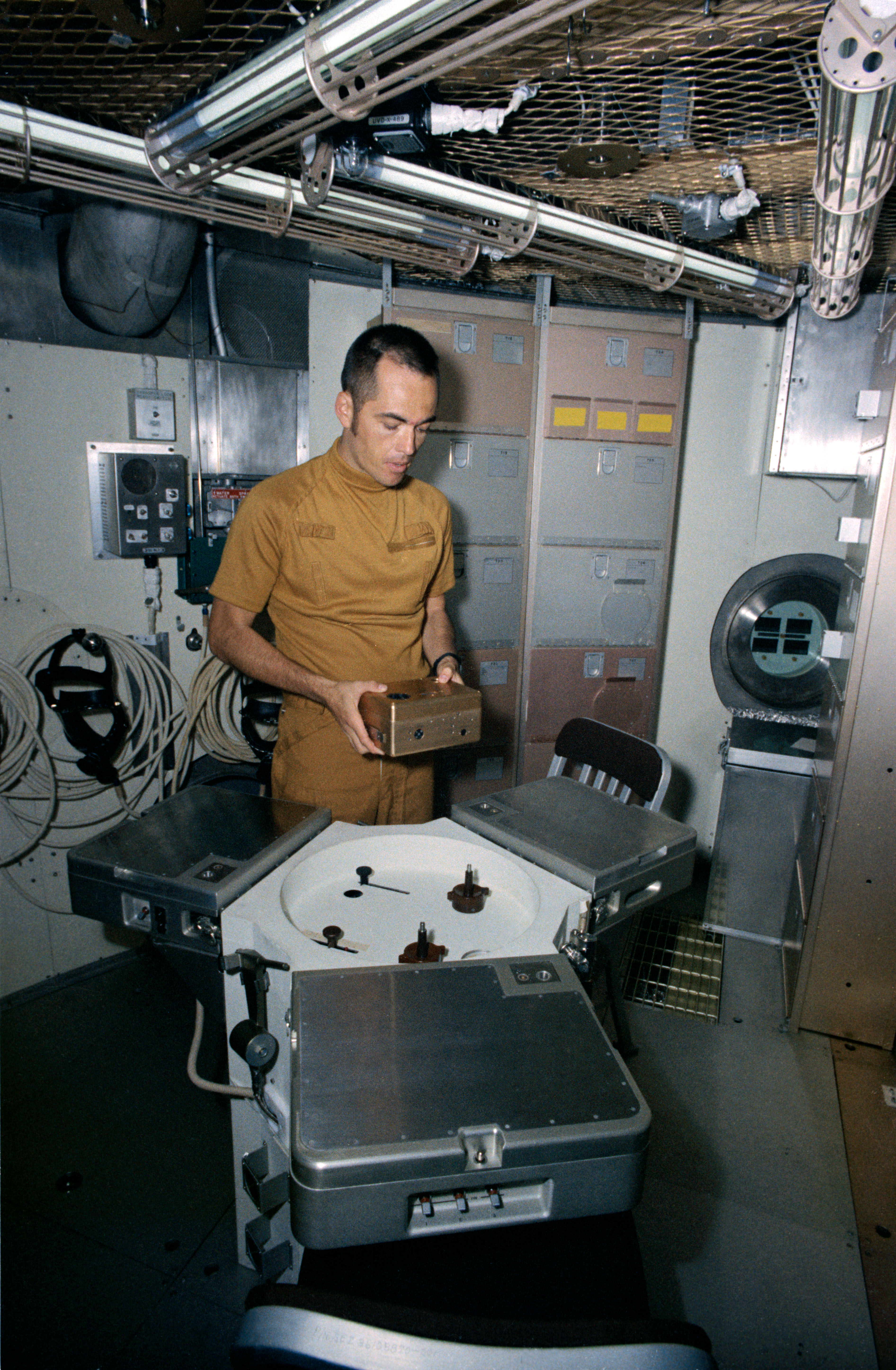 S72-43280 (15 June 1972) --- Astronaut Robert L. Crippen, Skylab Medical Experiment Altitude Test (SMEAT) commander, holds the training model of Skylab experiment T003, the aerosol analysis test, in this preview of SMEAT activity. He is part of a three-man SMEAT crew who will spend up to 56 days in the Crew Systems Division's 20-foot altitude chamber at the NASA Manned Spacecraft Center (MSC) beginning in mid-July to obtain medical data and evaluate medical experiment equipment for Skylab. The two crew members not shown in this view are astronauts Karol J. Bobko, SMEAT pilot, and Dr. William E. Thornton, SMEAT science pilot. Photo credit: NASA