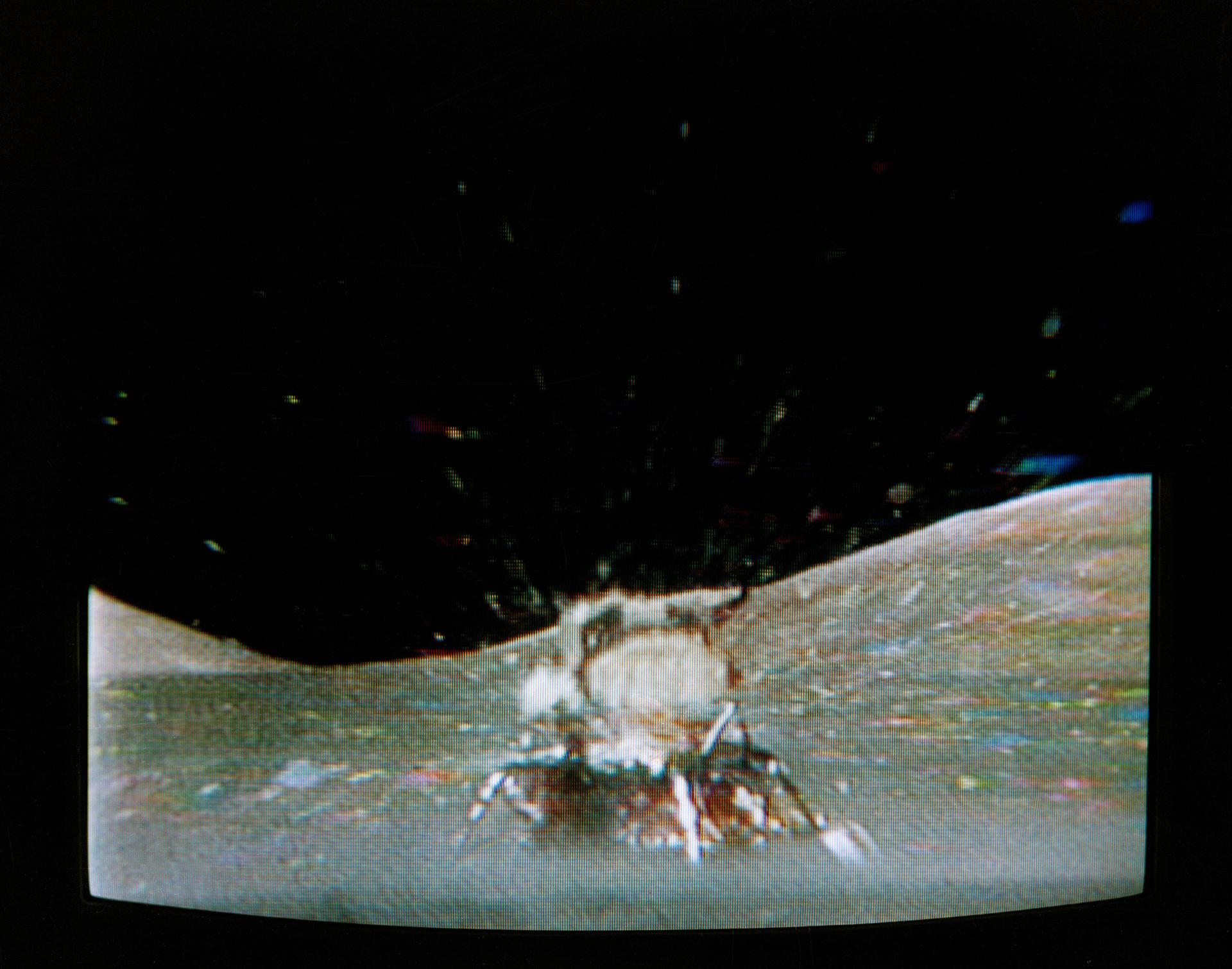 The Apollo 17 Lunar Module (LM) "Challenger" ascent stage leaves the Taurus-Littrow landing site as it makes its spectacular liftoff from the lunar surface, as seen in this reproduction taken from a color television transmission made by the color RCA TV camera mounted on the Lunar Roving Vehicle (LRV). The LRV-mounted TV camera, remotely controlled from the Mission Control Center (MCC) in Houston, made it possible for people on Earth to watch the fantastic event. The LM liftoff was at 188:01:36 ground elapsed time, 4:54:36 p.m. (CST), Thursday, December 14, 1972.