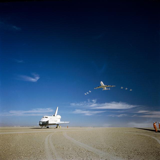 S77-28541 (23 Sept 1977) --- The NASA 747 carrier aircraft and six T-38 jets fly over the shuttle Orbiter 101 "Enterprise" soon after completion of a five-minute, 34-second unpowered mission during the third of a series of Shuttle Approach and Landing Tests (ALT) free-flights. Crew for the September 23, 1977, flight were astronauts Fred W. Haise Jr., commander, and C. Gordon Fullerton, pilot. Touchdown was 786 feet beyond aim point in the desert land of Edwards Air Force Base in Southern California.