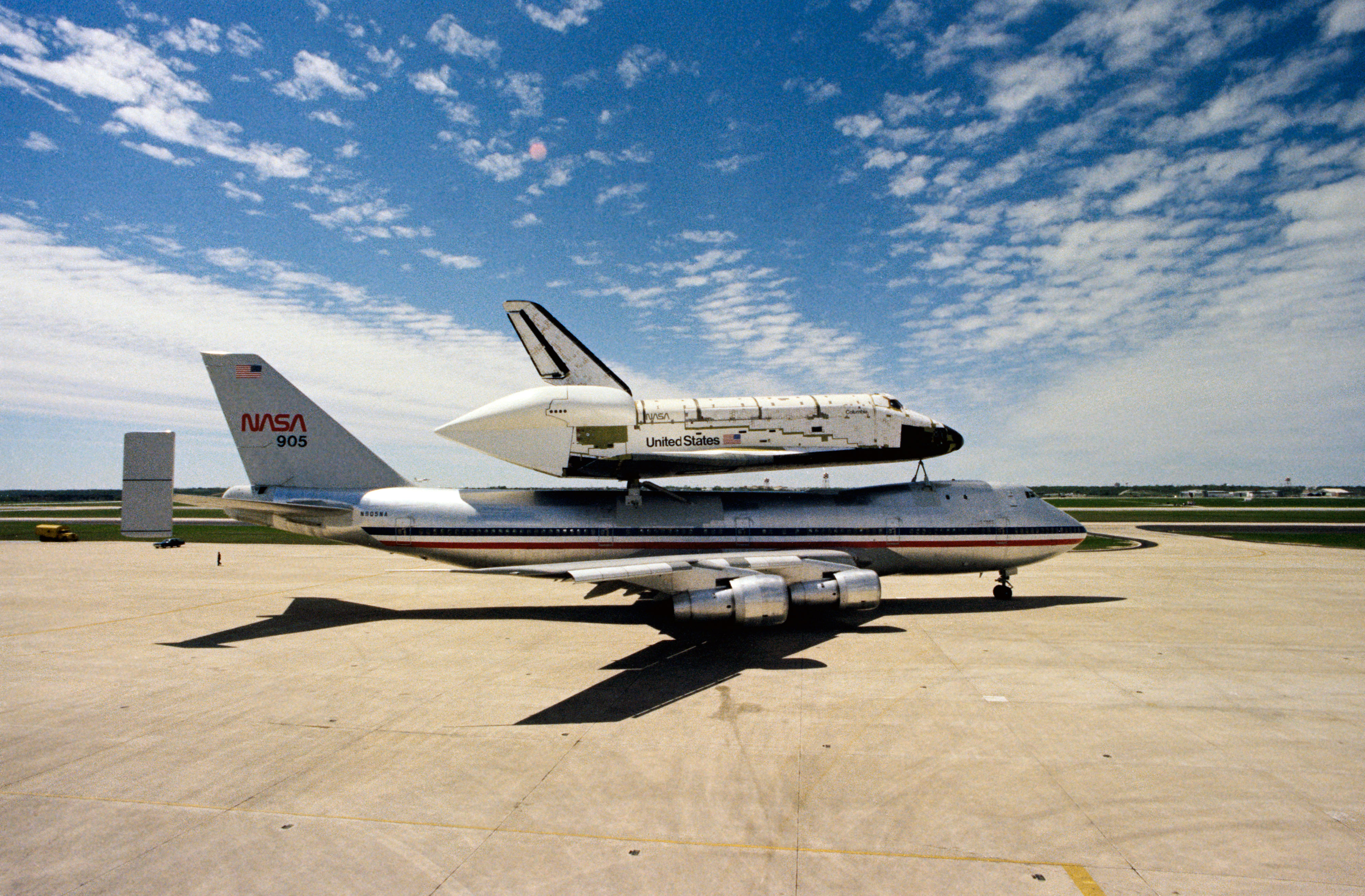 S79-30103 (23 March 1978) --- A side view of the huge space shuttle orbiter 102 Columbia mated atop its 747 carrier aircraft--NASA 905?in ?piggyback? mode, ready for takeoff from Kelly Air Force Base. Kelly AFB was one of the scheduled stops enroute to the Kennedy Space Center from the Dryden Flight Research Center in southern California. The ferry flight covered about 2,400 miles. Columbia reached Dryden Flight Research Center from its Palmdale manufacturing facility, some 35 miles away, via powerful transport vehicle. At DFRC, the Columbia and 747 were mated for the flight to Florida. Orbiter 102 will be the first shuttle vehicle in space when the orbital flight test (OFT) series begins next year. Photo credit: NASA