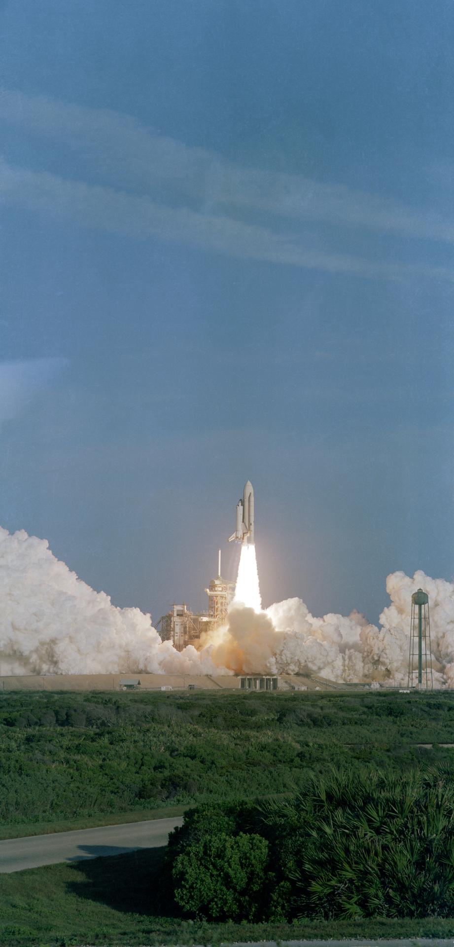 S81-30460 (12 April 1981) --- A remote camera at the Kennedy Space Center's Launch Pad 39A captured this scene as the maiden flight of space shuttle Columbia begins. Astronauts John W. Young, STS-1 commander, and Robert L. Crippen, pilot, are aboard Columbia as it begins an orbital mission scheduled to last some 54 hours. The flight will end on April 14 with an unpowered landing at Edwards Air Force Base in California. Three main engines and two solid rocket boosters are necessary to boost the 150,000 pound orbiter into Earth orbit. Photo credit: NASA or National Aeronautics and Space Administration
