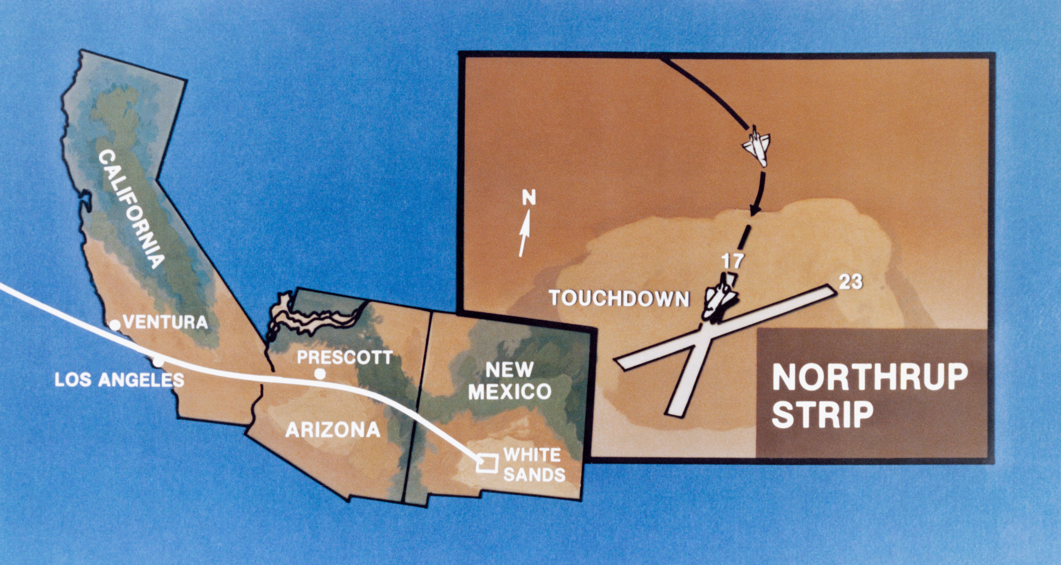 Art Concept of the End-of-Mission Approach and Landing at WSTF, NM, from Rockwell. 1. ART CONCEPT - STS-3 LANDING 2. STS-3 - LANDING WSTF, NM Also available in 4x5 B&W