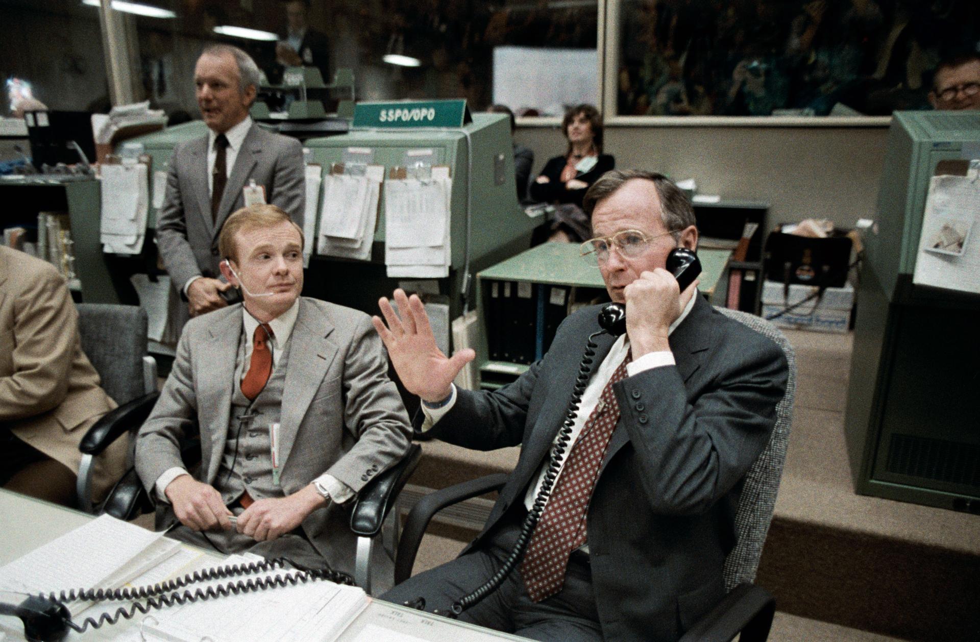S83-30192 (8 April 1983) --- Vice President George Bush talks to the Earth-orbiting STS-6 astronauts from the spacecraft communicators; (CAPCOM) console in the mission operations control room (MOCR) of the Johnson Space Center?s mission control center. Astronaut Roy D. Bridges, is one of the CAPCOM personnel on duty. JSC Director Gerald D. Griffin, left, watches a large monitor (out of frame) on which the TV scene of the four-member Challenger crew is visible. This photo was made by Otis Imboden.