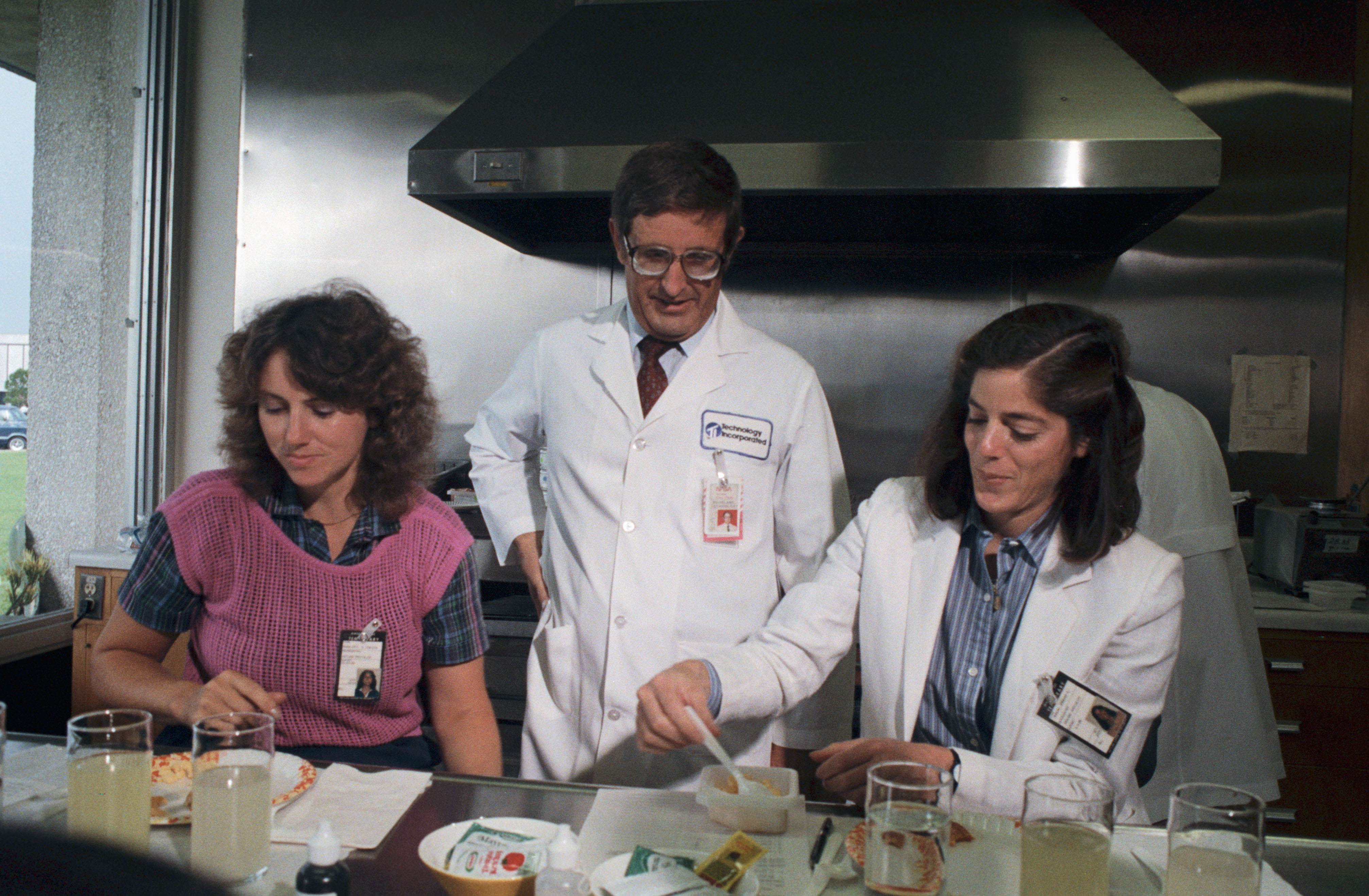 S85-39979 (10 Sept. 1985) --- Two teachers training for participation in the STS-51L flight get their first introduction to space food during an orientation session in the life sciences building at the Johnson Space Center (JSC). Sharon Christa McAuliffe (left) chews on a morsel while Barbara R. Morgan reaches for a bite. Dr. C.T. Bourland of Technology, Incorporated, looks on. McAuliffe was chosen from among ten finalists as prime citizen observer payload specialist and Morgan was named as backup for the STS-51L flight. Photo credit: NASA