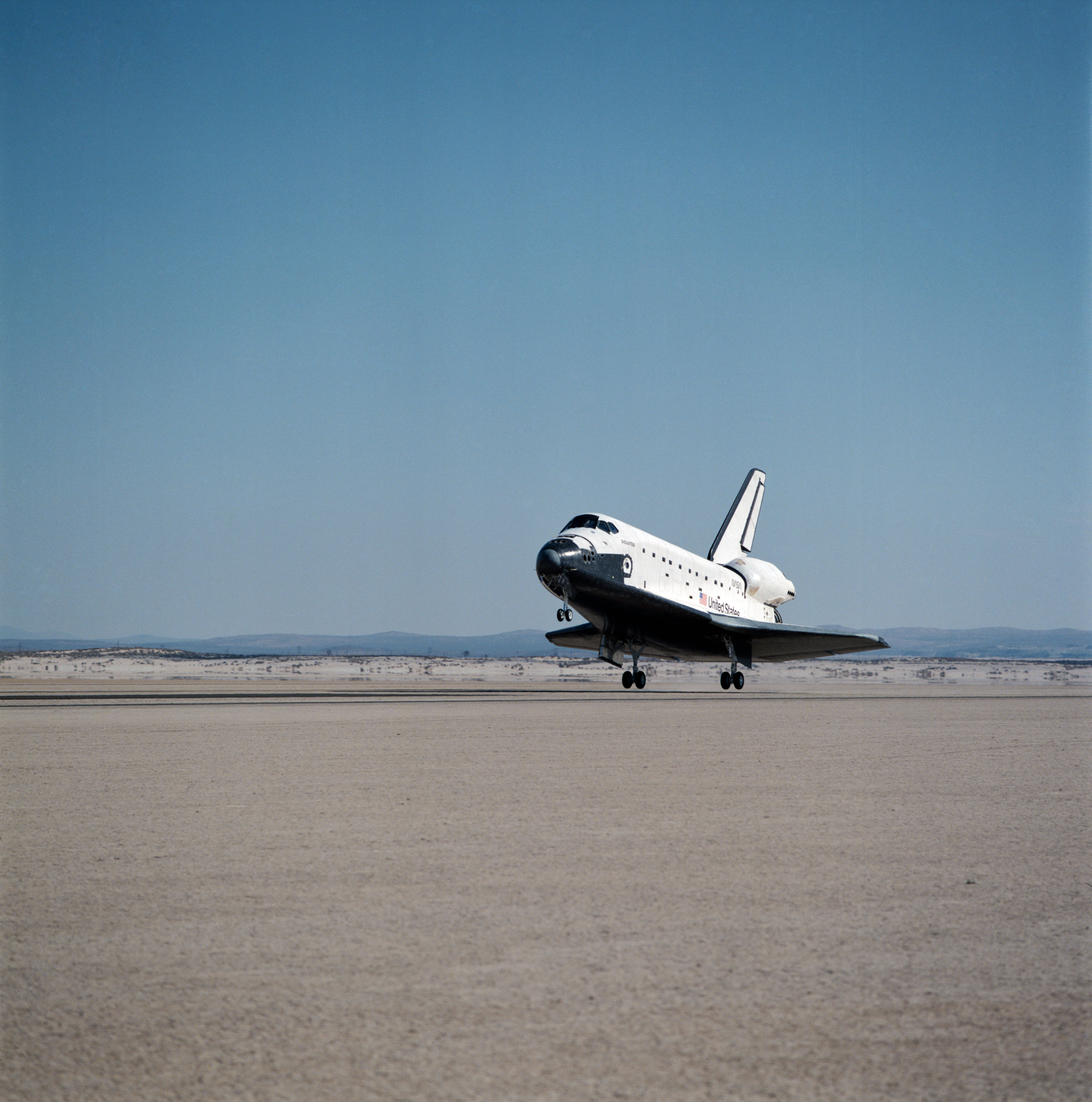 DFRF views of "Atlantis" Touchdown, Landing and Egress at the end of the STS-28/51J Mission, 10/07/1985.