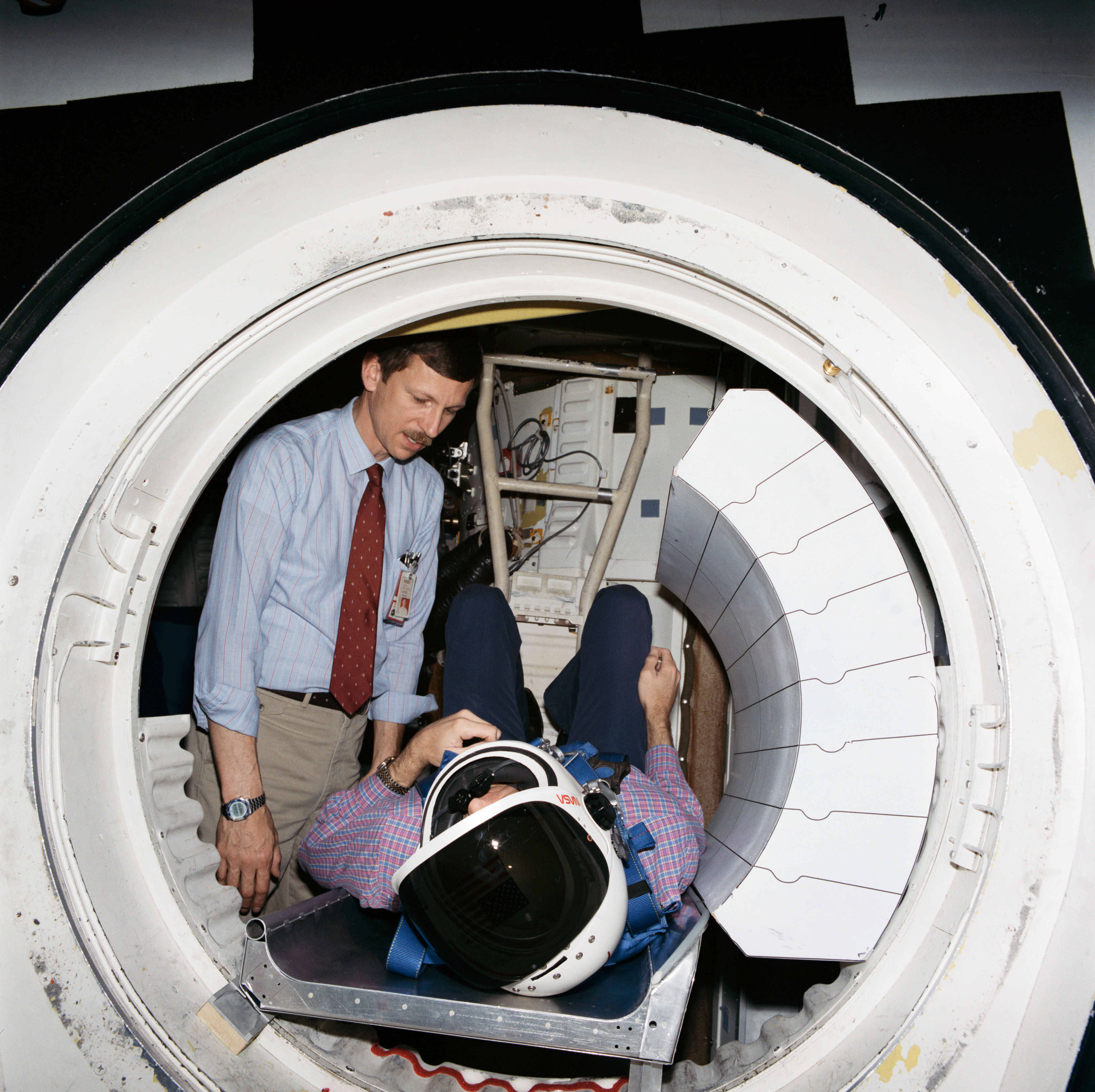 Shuttle crew escape systems test is conducted by astronauts Steven R. Nagel (left) and Manley L. (Sonny) Carter in JSC One Gravity Mockup and Training Facilities Bldg 9A crew compartment trainer (CCT). Nagel and Carter are evaluating methods for crew escape during Space Shuttle controlled gliding flight. JSC test was done in advance of tests scheduled for facilities in California and Utah. Here, Carter serves as test subject evaluating egress positioning for the tractor rocket escape method - one of the two systems currently being closely studied by NASA.