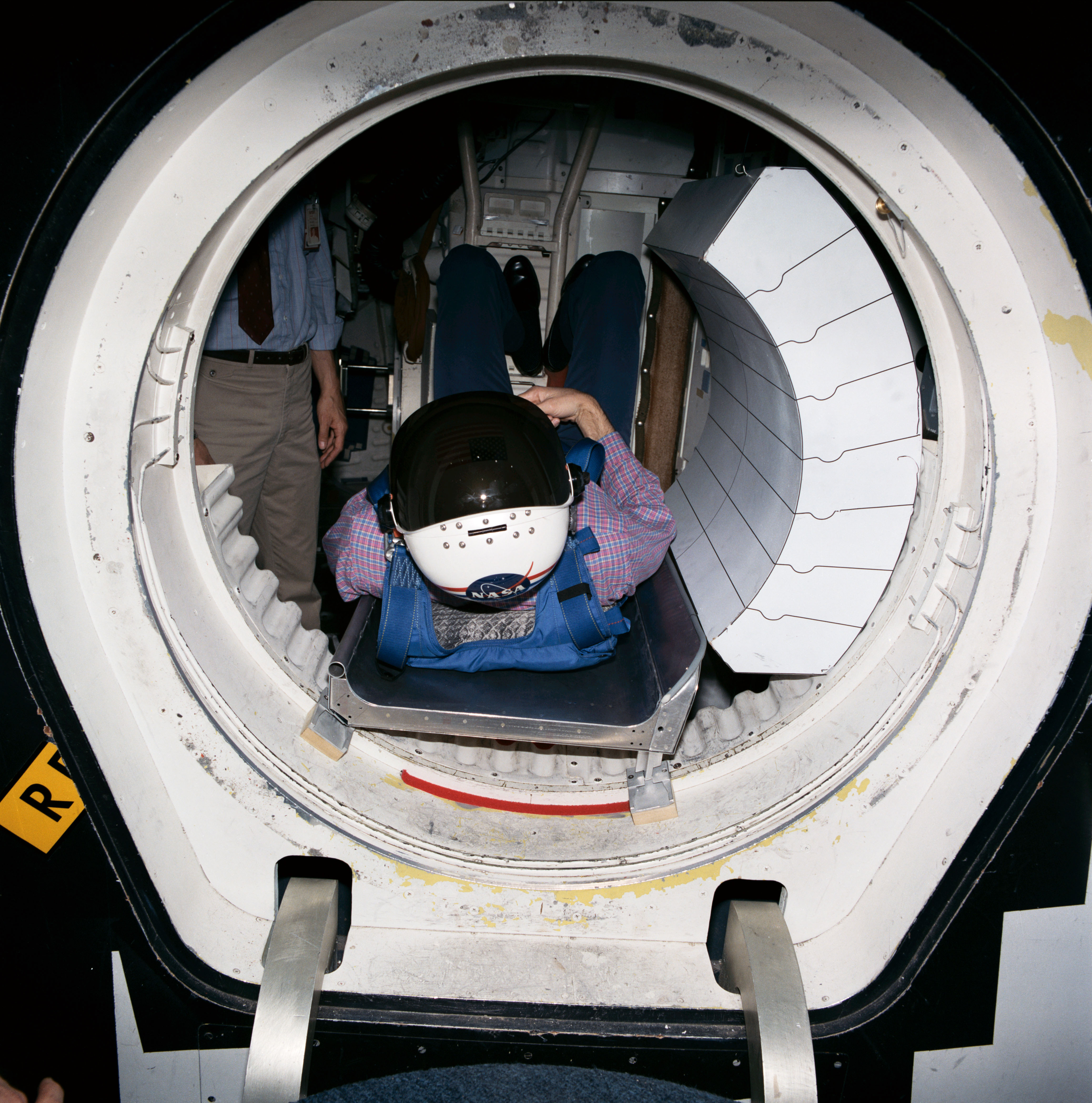 Shuttle crew escape systems test is conducted by astronauts Steven R. Nagel (left) and Manley L. (Sonny) Carter in JSC One Gravity Mockup and Training Facilities Bldg 9A crew compartment trainer (CCT). Nagel and Carter are evaluating methods for crew escape during Space Shuttle controlled gliding flight. JSC test was done in advance of tests scheduled for facilities in California and Utah. Here, Carter serves as test subject evaluating egress positioning for the tractor rocket escape method - one of the two systems currently being closely studied by NASA.