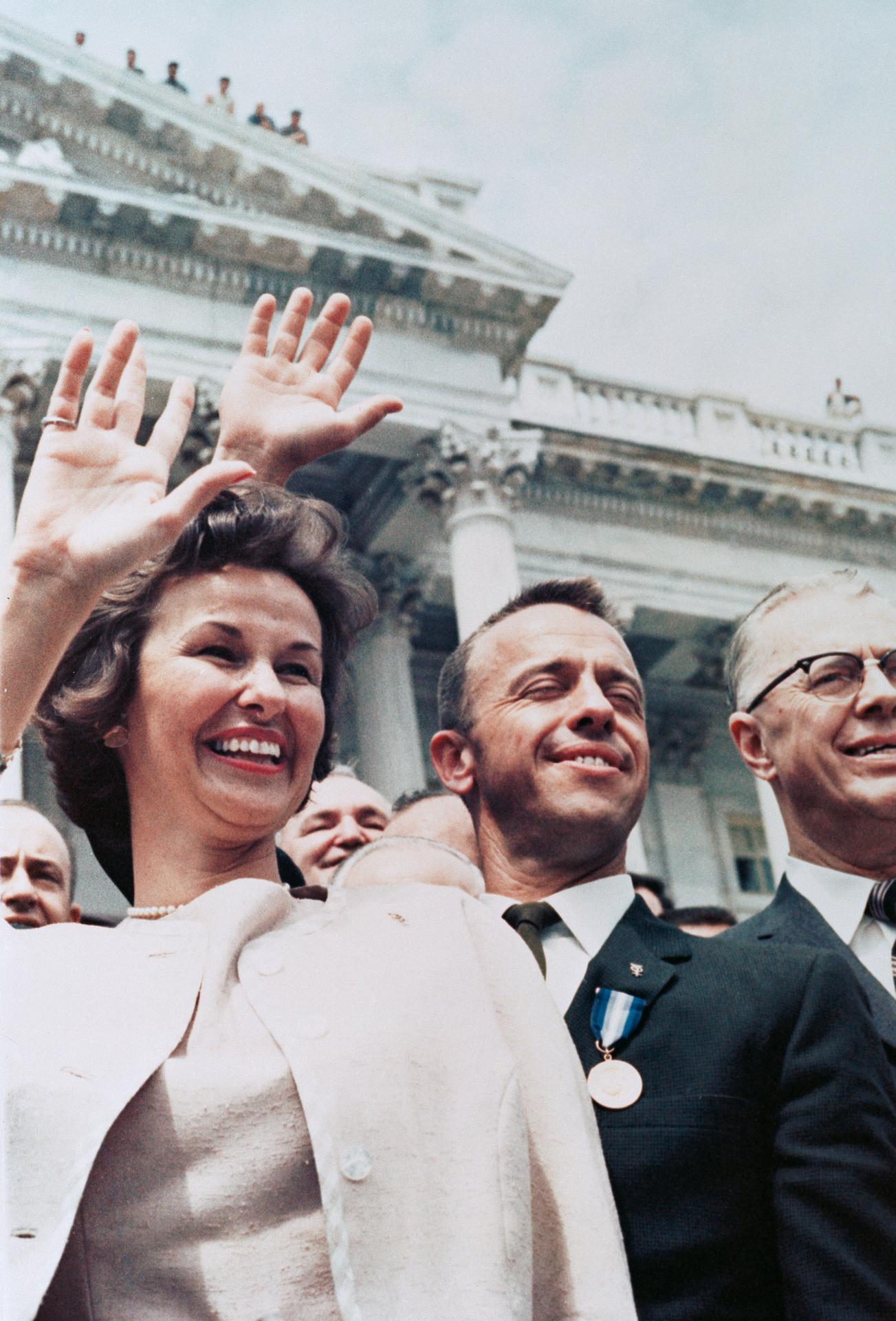 S88-31388 (8 May 1961) --- Astronaut Alan B. Shepard Jr. (center), along with wife Louise, waves to a crowd outside the U.S. Capitol building. Shepard, Mercury-Redstone 3 astronaut, had earlier briefed Congress on the first U.S. manned spaceflight -- a 15-minute suborbital mission on May 5, 1961, aboard the Freedom 7 capsule. (NASA Hq. Photo No., MR3-49) Photo credit: NASA or National Aeronautics and Space Administration