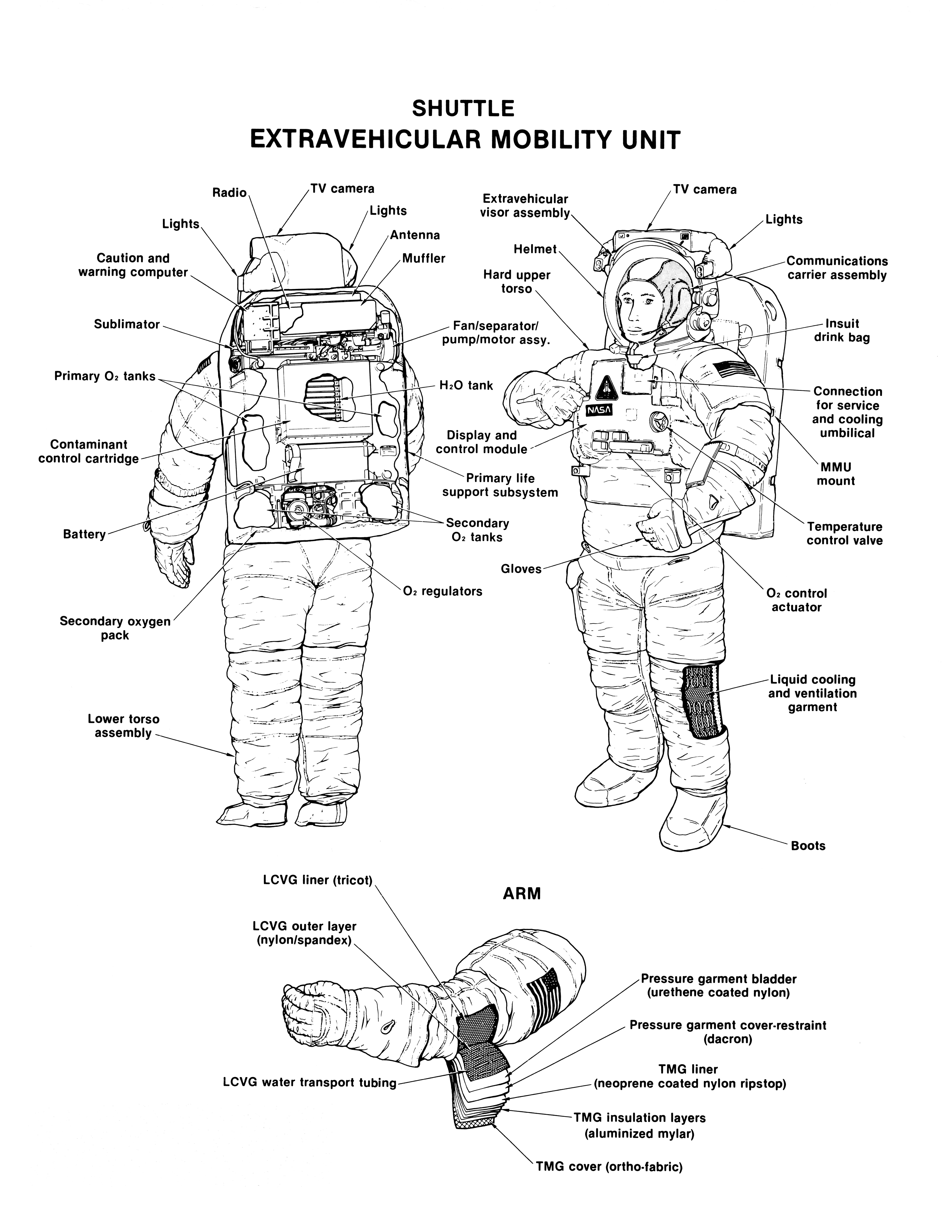 Labeled cutaway line drawing of the Shuttle extravehicular mobility unit (EMU) identifies its various components and equipment. The portable life support system (PLSS) and protective layers of fabric (thermal micrometeoroid garment (TMG)) incorporated in this extravehicular activity (EVA) space suit are shown.