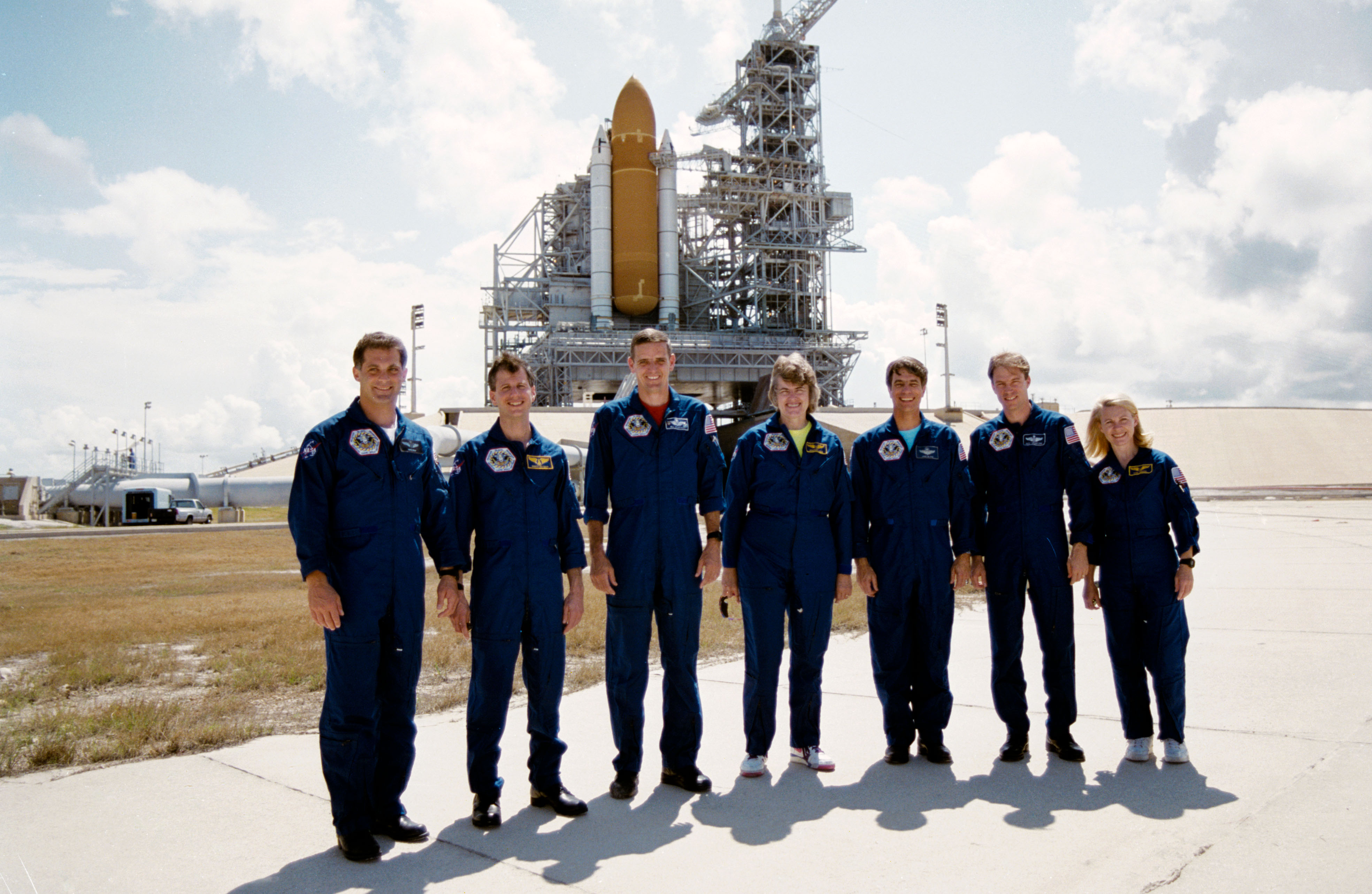 S93-45003 (20 Sept 1993) --- Posing for a crew portrait, in front of the Space Shuttle Columbia at Launch Pad 39B, are the seven STS-58 astronauts. They are, left to right, David A. Wolf, mission specialist; Martin J. Fettman, payload specialist; William S. McArthur and Shannon W. Lucid, mission specialists; John E. Blaha, mission commander; Richard A. Searfoss, pilot; and Rhea Seddon, payload commander. The crew was in Florida for the Terminal Countdown Demonstration Test (CDDT) in preparation for next month's launch aboard Columbia. (Kennedy Space Center Photo ID: KSC-93-PC-1253)