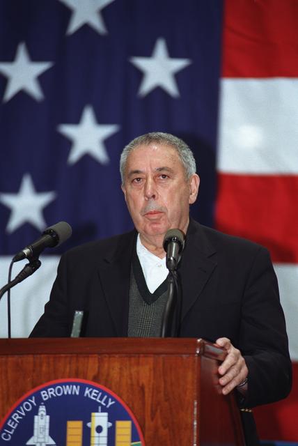 S99-16060 (28 December 1999) --- George W.S. Abbey, JSC Director, addresses a crowd on hand for the STS-103 crew return event at Ellington Field.